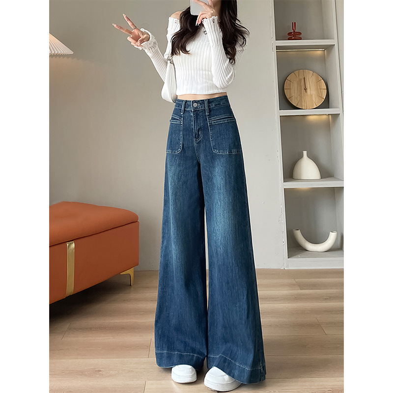 レトロブルーのハイストリートワイドレッグジーンズ、女性用、トレンディで多用途、アメリカのトレンディなブランドデザイン、ハイウエスト、スリムなスコールズソードパンツ
