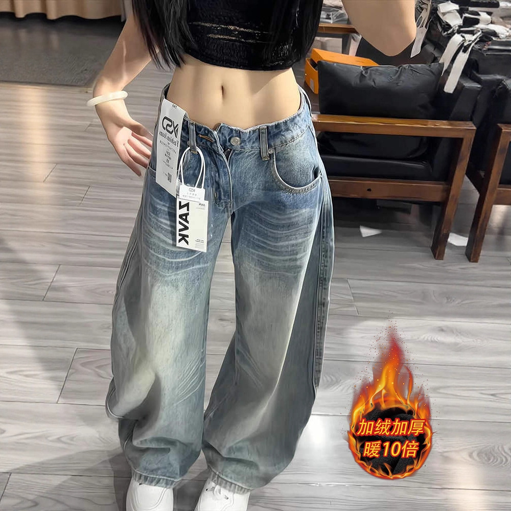 加绒加厚美式弯刀牛仔裤春秋款女水洗新款宽松高腰显瘦小个子裤子