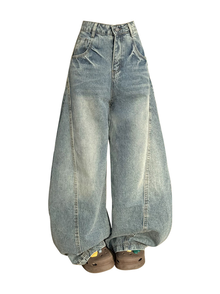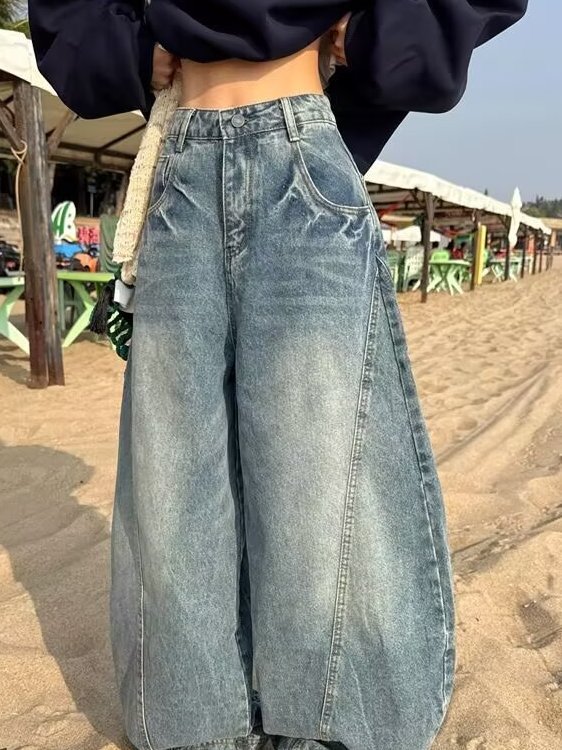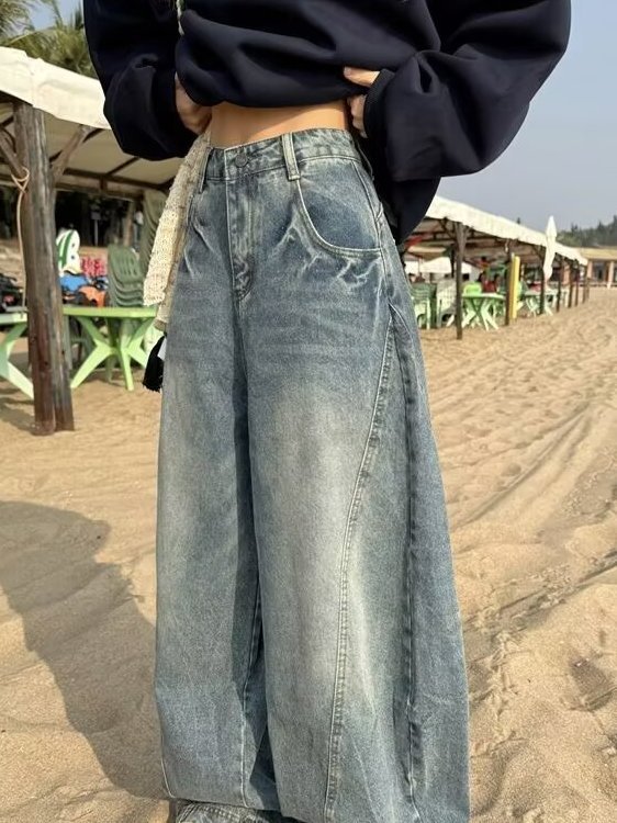 アメリカのレトロなワイドジーンズの女性は秋に腰が高くてゆったりしています。