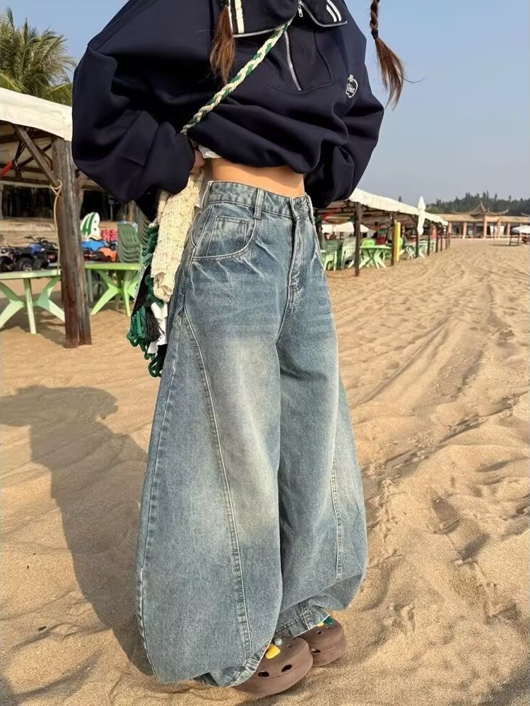 アメリカンレトロブルー三日月ジーンズ女性の夏の 2025 新しい鎌ルーズフロアモップワイドレッグパンツ