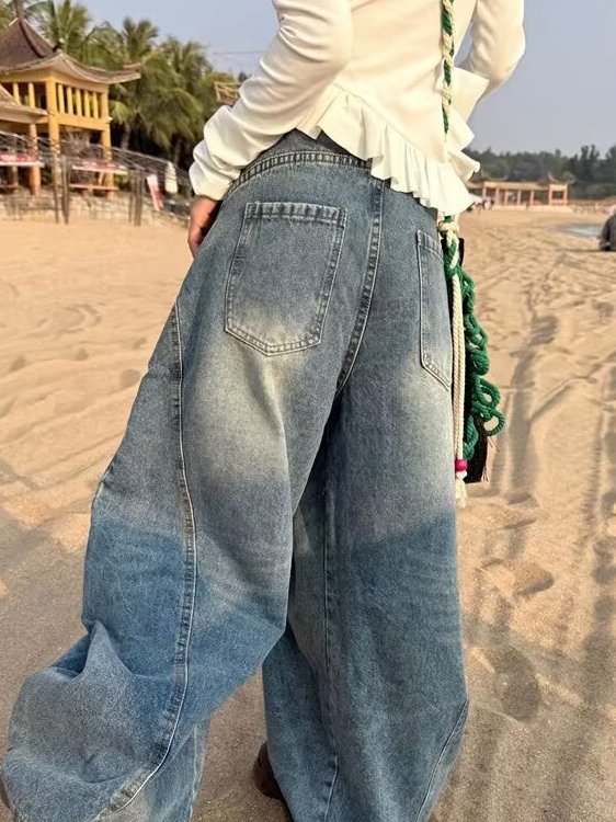 美式高街浅色水洗牛仔裤女秋冬设计感小众宽松直筒慵懒弯刀阔腿裤