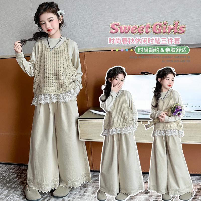 女童秋装三件套2025新款中大童花边打底衫牛仔马甲阔腿裤套装初秋
