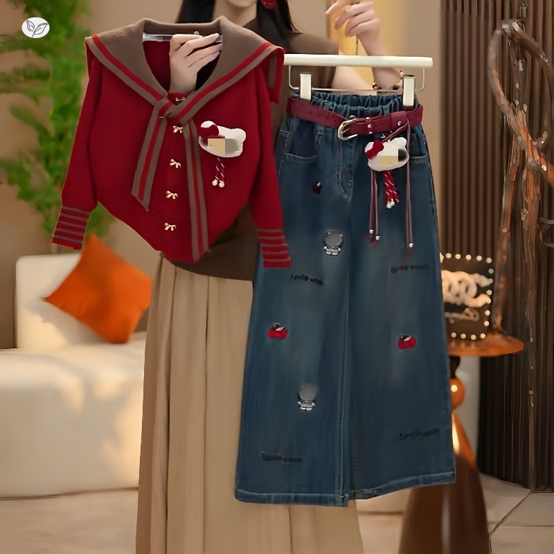 女童新年款红毛衣牛仔裤套装 毛衣送玩偶 裤子只送腰带