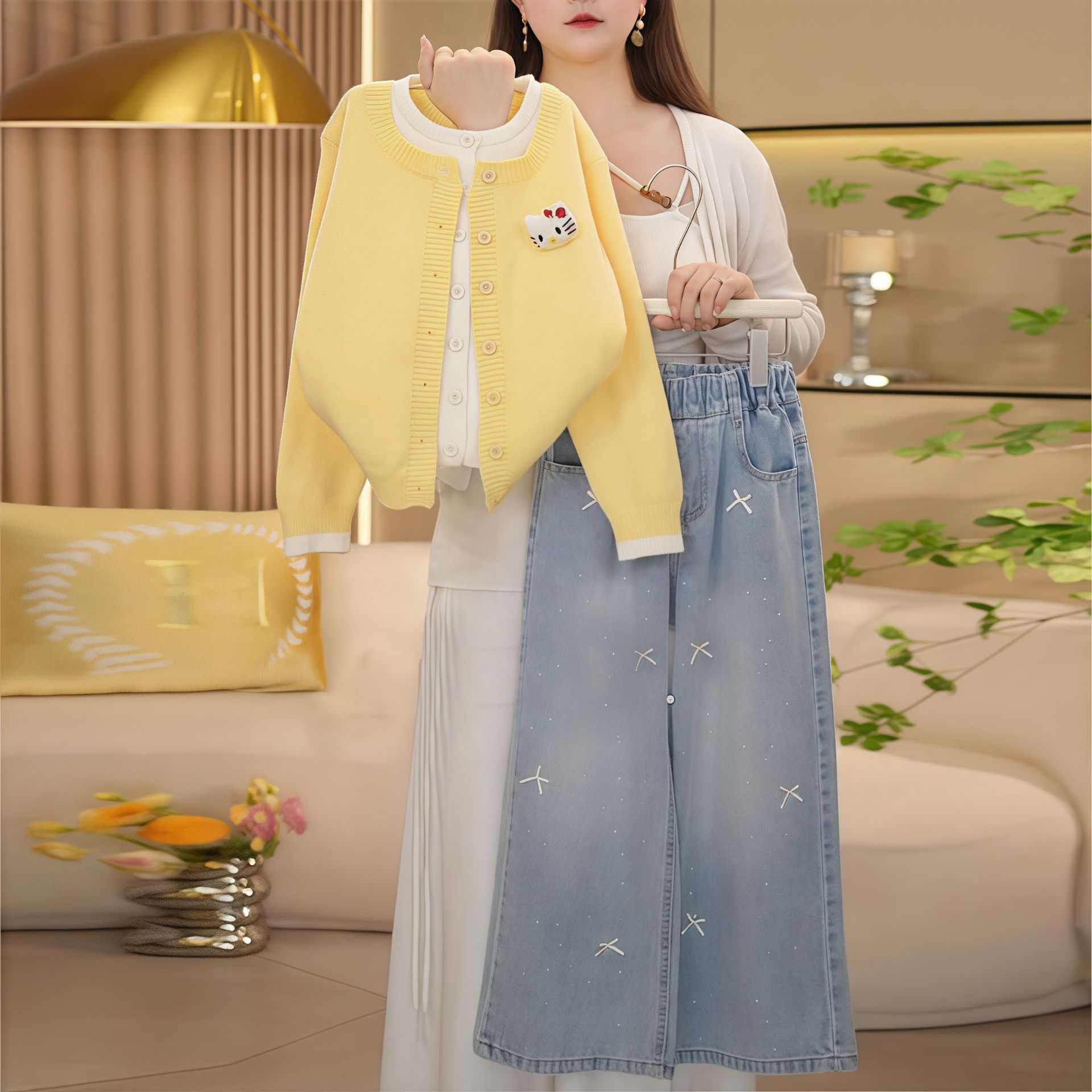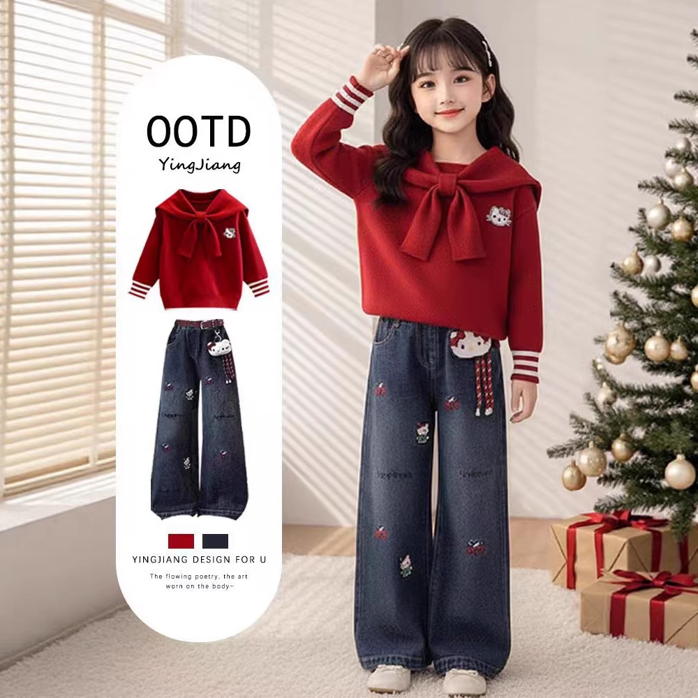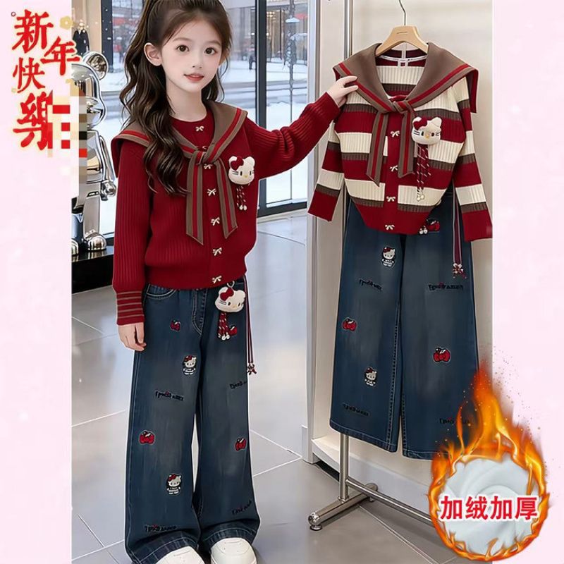 女童秋冬套装2025新款洋气中大童海军领针织毛衣卡通牛仔裤套装潮
