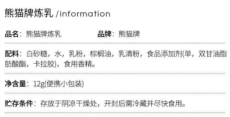 包装规格 §熊猫炼乳12g*60袋⚑⚑,§熊猫炼乳12g*50袋⚑⚑,§熊猫炼乳12g*30袋⚑⚑,§熊猫炼乳12g*20袋⚑⚑,§熊猫炼乳12g*10袋⚑⚑,§熊猫炼乳12g*5袋⚑⚑,§熊猫可宝甜奶酱350g⚑⚑