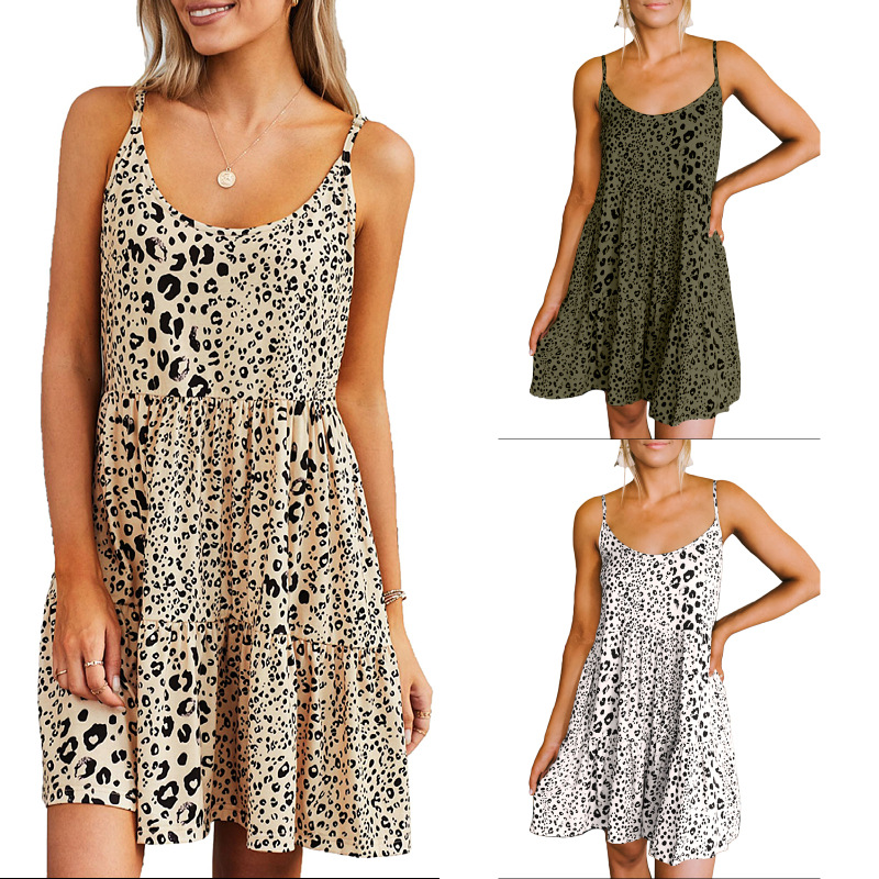クロスボーダー夏の新しい女性のカジュアルノースリーブワンピースドレスアマゾンヒョウ柄ポケットルーズサスペンダーオールインワンスカート