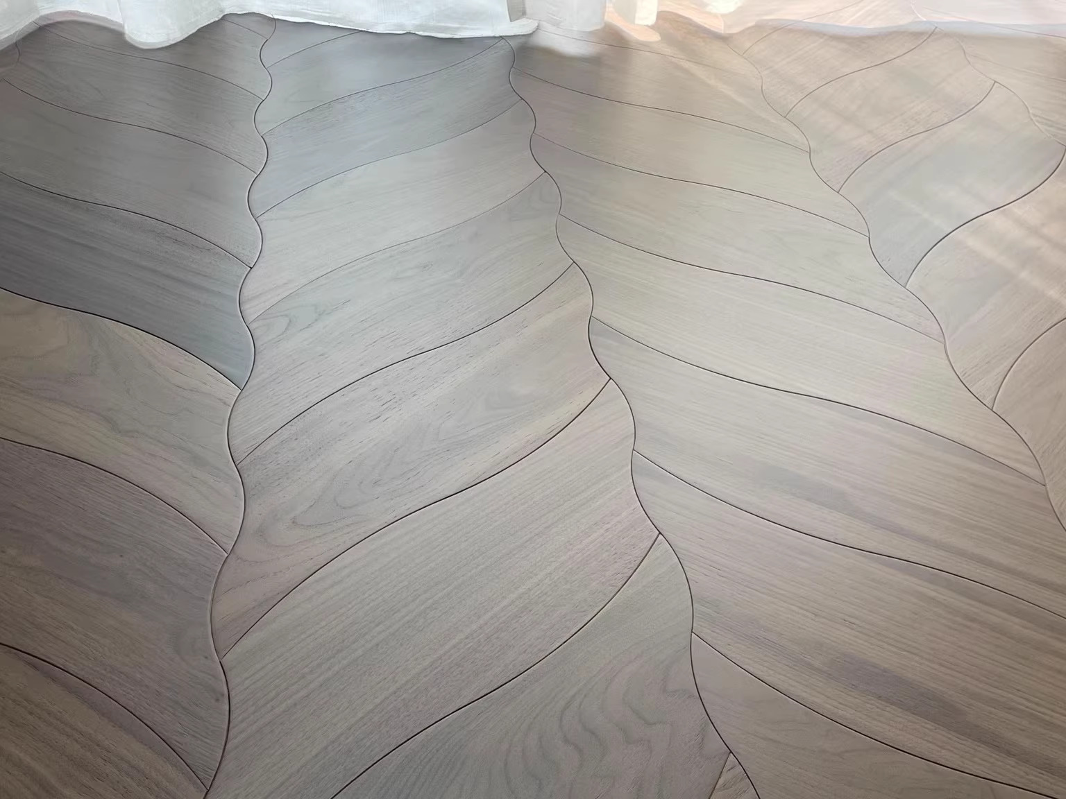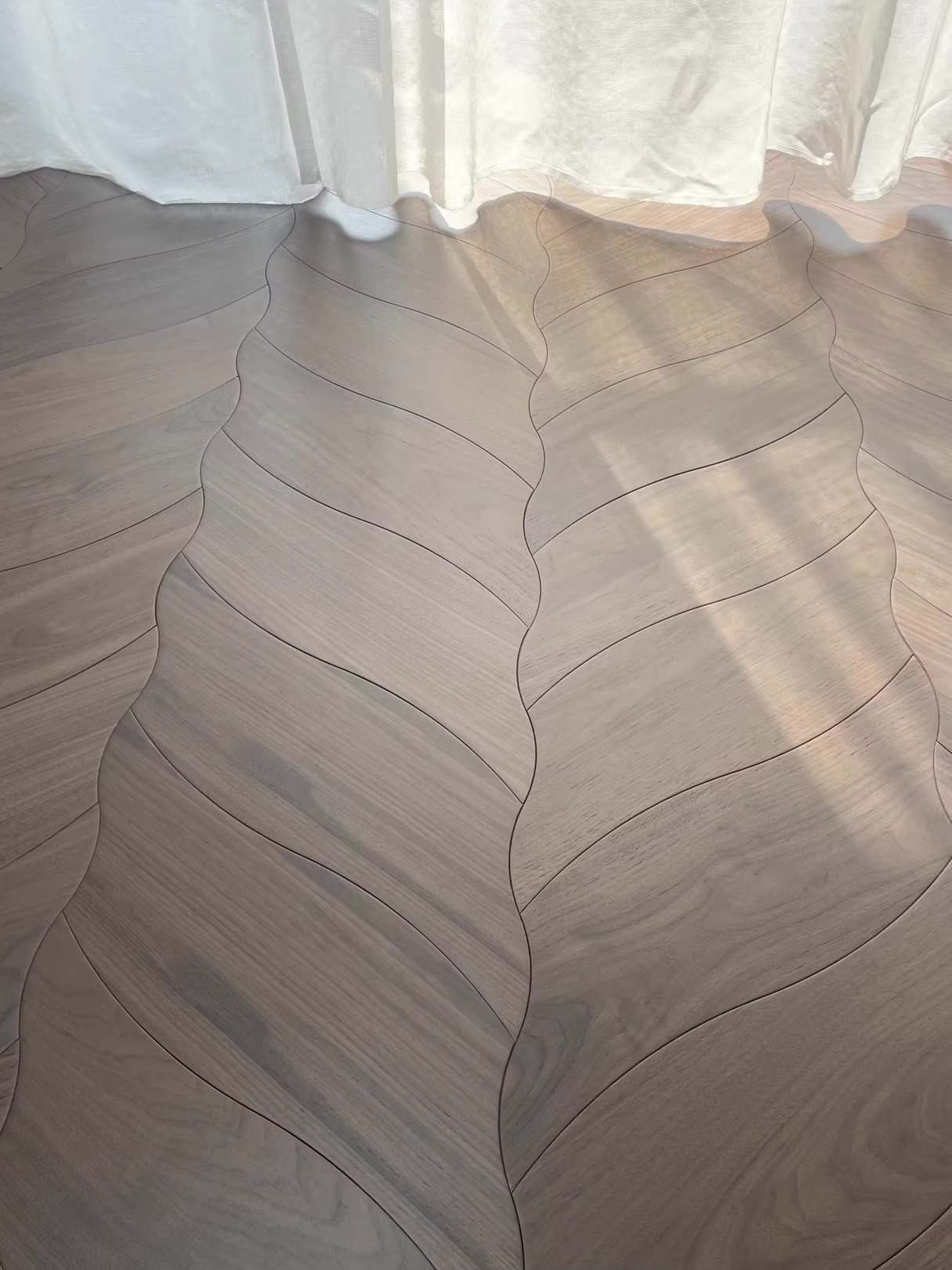 黒クルミ材とオーク材の大きな蓮の葉模様の寄木細工床材、無垢材の特殊形状寄木細工、多層複合床材、床暖房