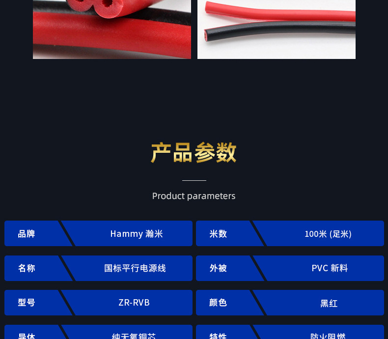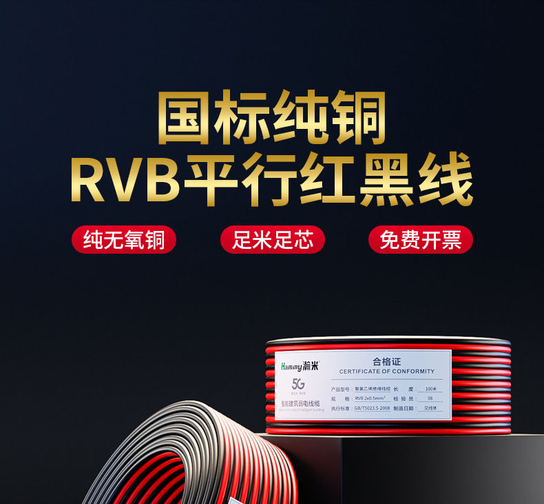 规格型号 国标红黑双并线RVB纯铜【2*0.3mm²】100米,国标红黑双并线RVB纯铜【2*0.5mm²】100米,国标红黑双并线RVB纯铜【2*0.75mm²】100米,国标红黑双并线RVB纯铜【2*1.0mm²】100米,国标红黑双并线RVB纯铜【2*1.5mm²】100米