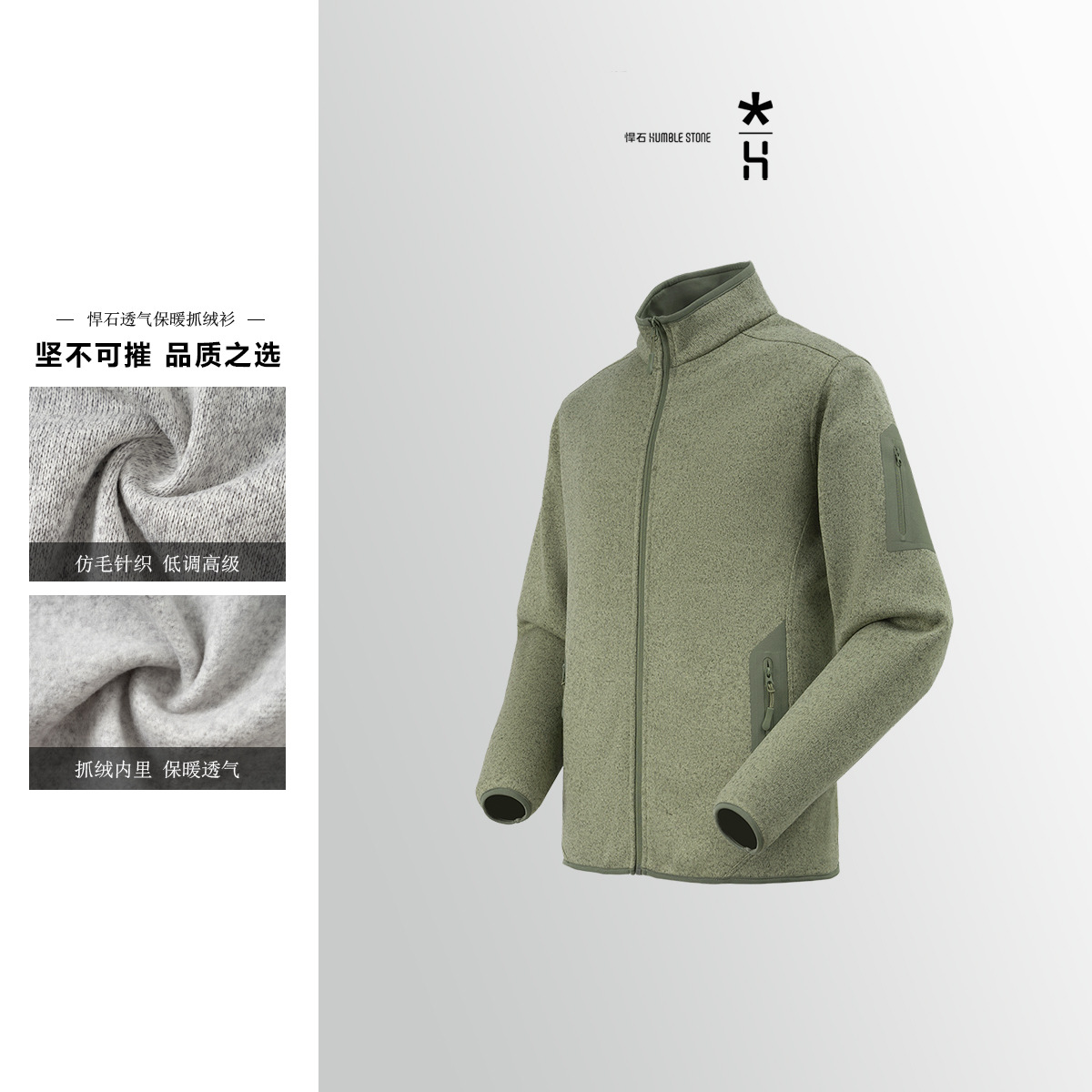 灰绿色抓绒衣外套男春秋季户外拉链立领夹克美式复古开衫卫衣上衣