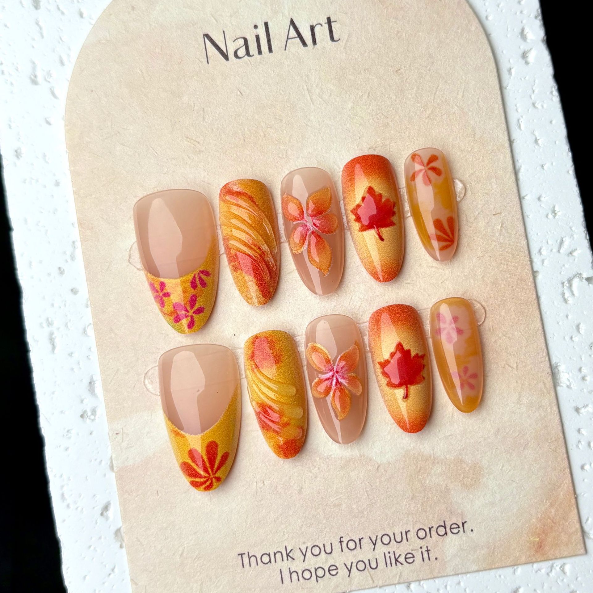 秋冬爆款红色落叶晕染氛围感穿戴甲跨境热销滴胶法式鱼尾美甲贴片