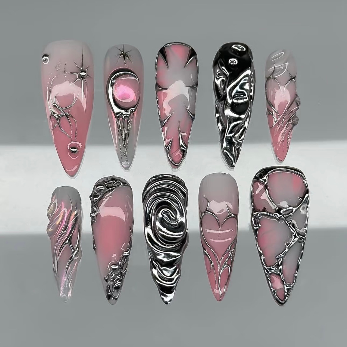跨境欧美爆款鎏银长杏仁穿戴甲辣妹猫眼30片珠光美甲贴片粉色ins
