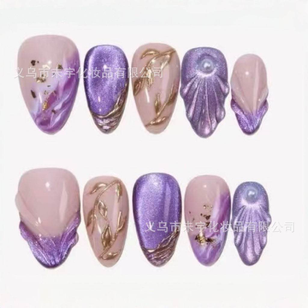滴胶法式梦幻紫鎏金穿戴甲短短杏仁甜妹高级美甲贴片温柔少女风