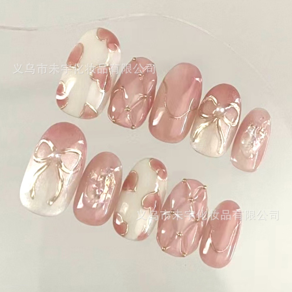 日系粉嫩爱心鎏金穿戴甲渐变蝴蝶结可爱美甲贴片小众显白温柔ins