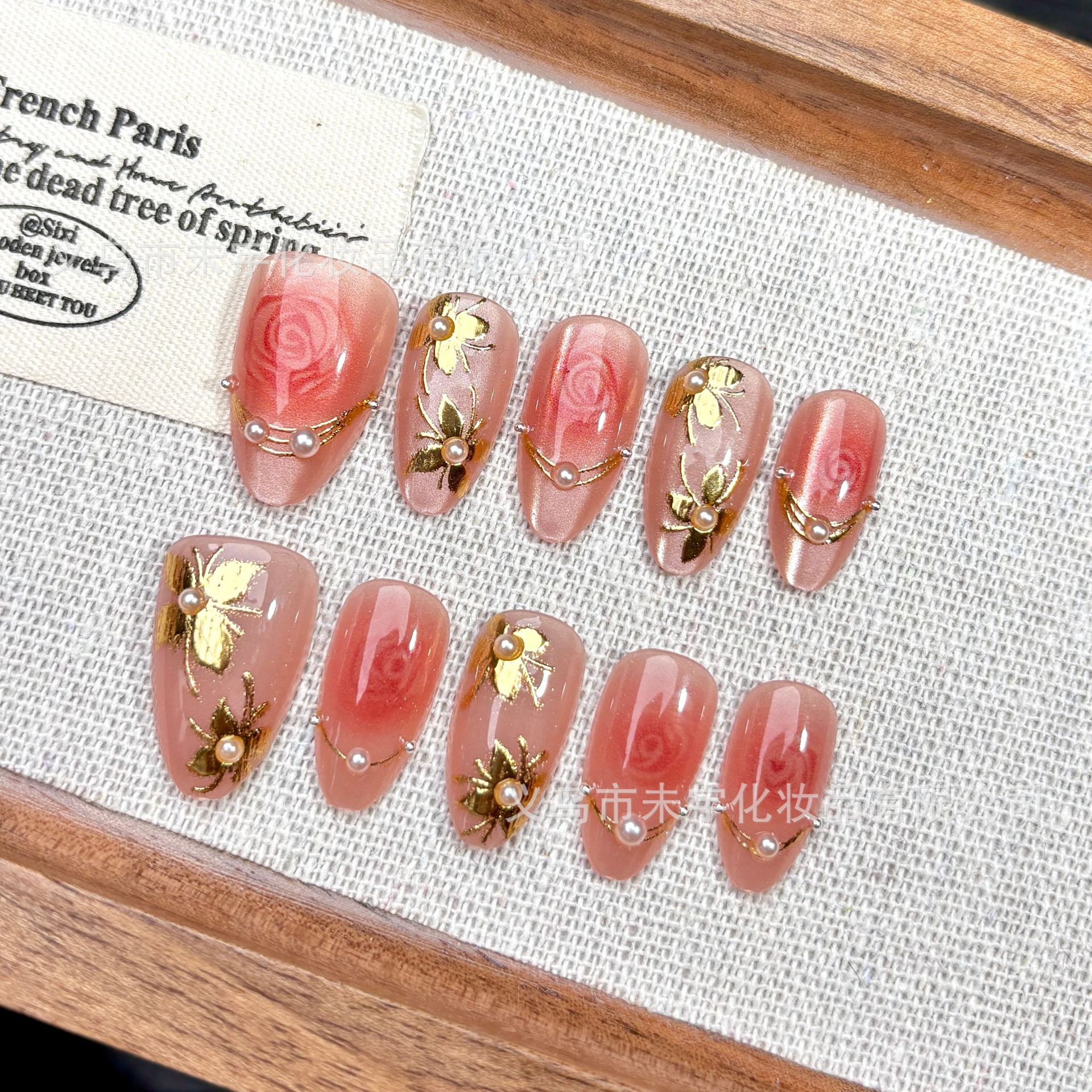 短短杏仁玫瑰花猫眼鎏金穿戴甲水彩晕染仙气美甲贴片珍珠优雅轻奢