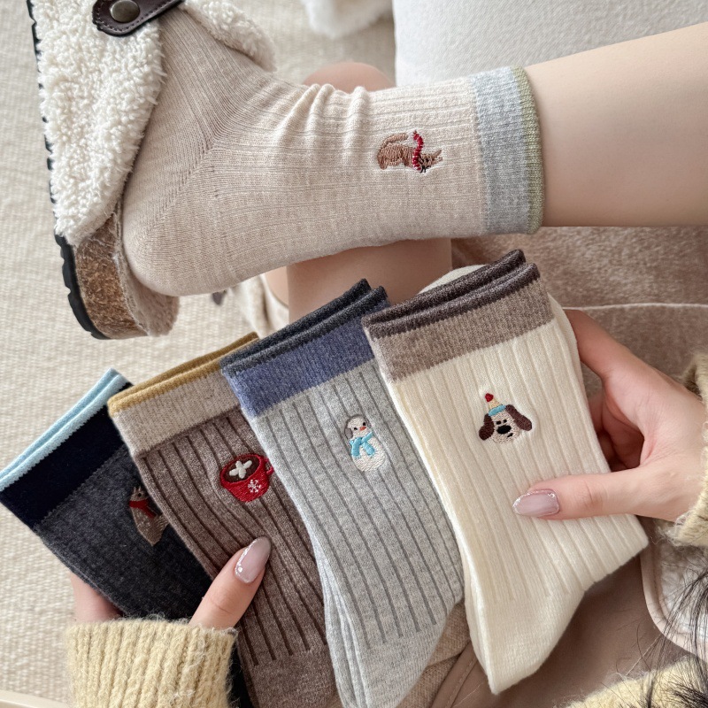 袜子女春秋款刺绣卡通无骨堆堆袜精梳棉韩系百搭ins中筒堆堆袜