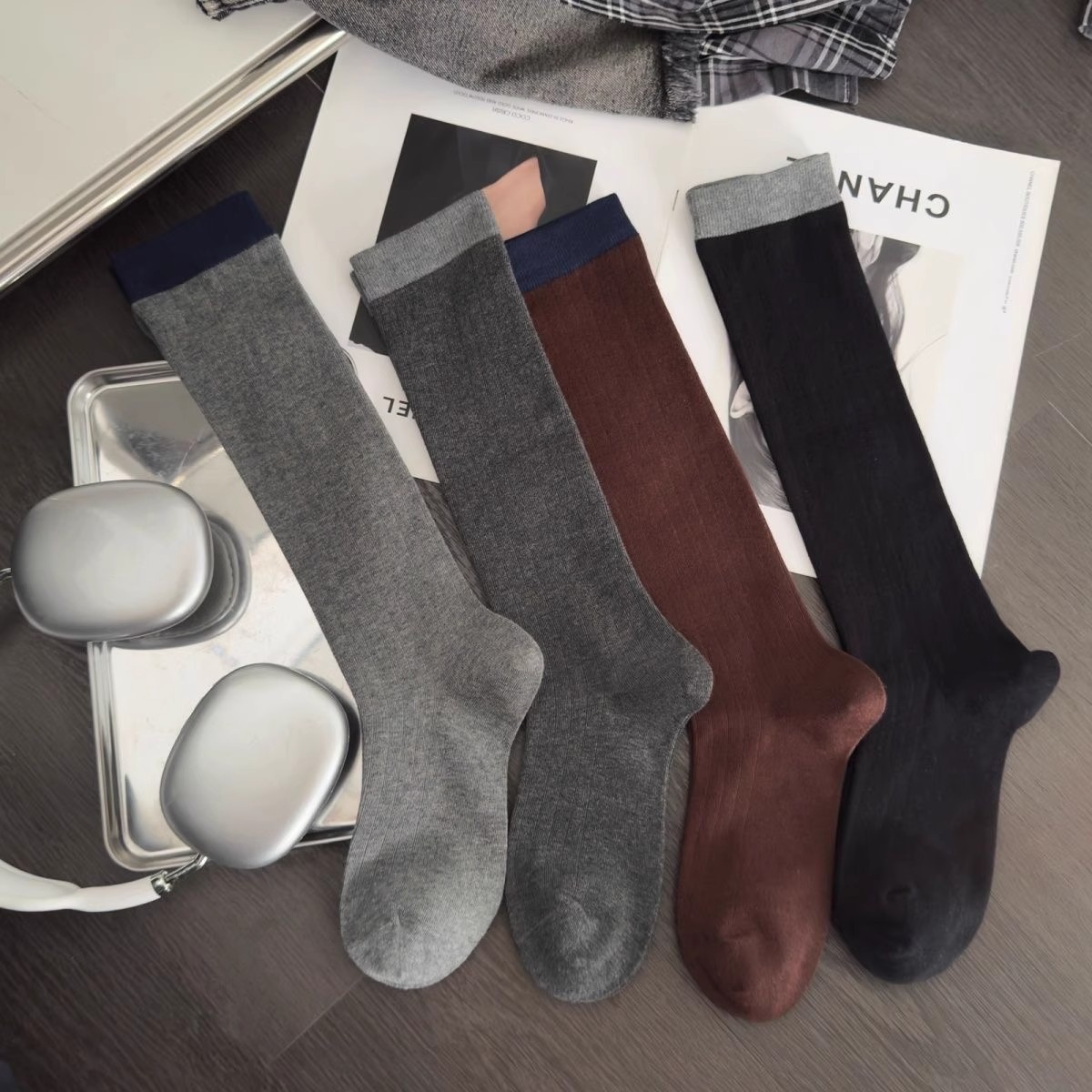 新款秋冬季黑色针织小腿袜女罗口撞色纯棉显瘦堆堆袜诸暨袜子批发