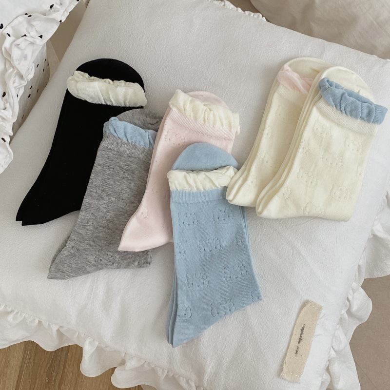 春夏薄手メッシュ中空綿ミッドカーフソックス日本製バブルレースバレエ風KTキャットウーマンパイルソックス