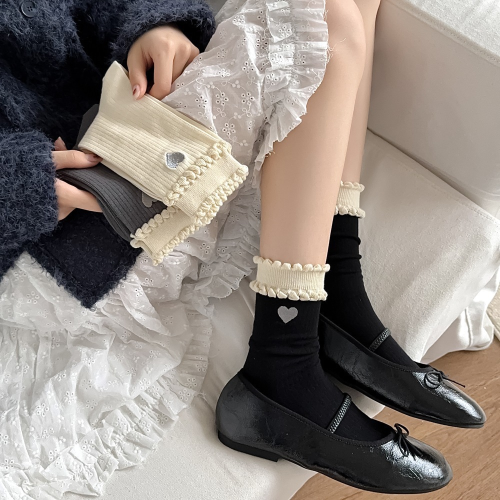 杂志同款2025秋冬新款韩版刺绣爱心堆堆袜花边中筒学院风女袜批发