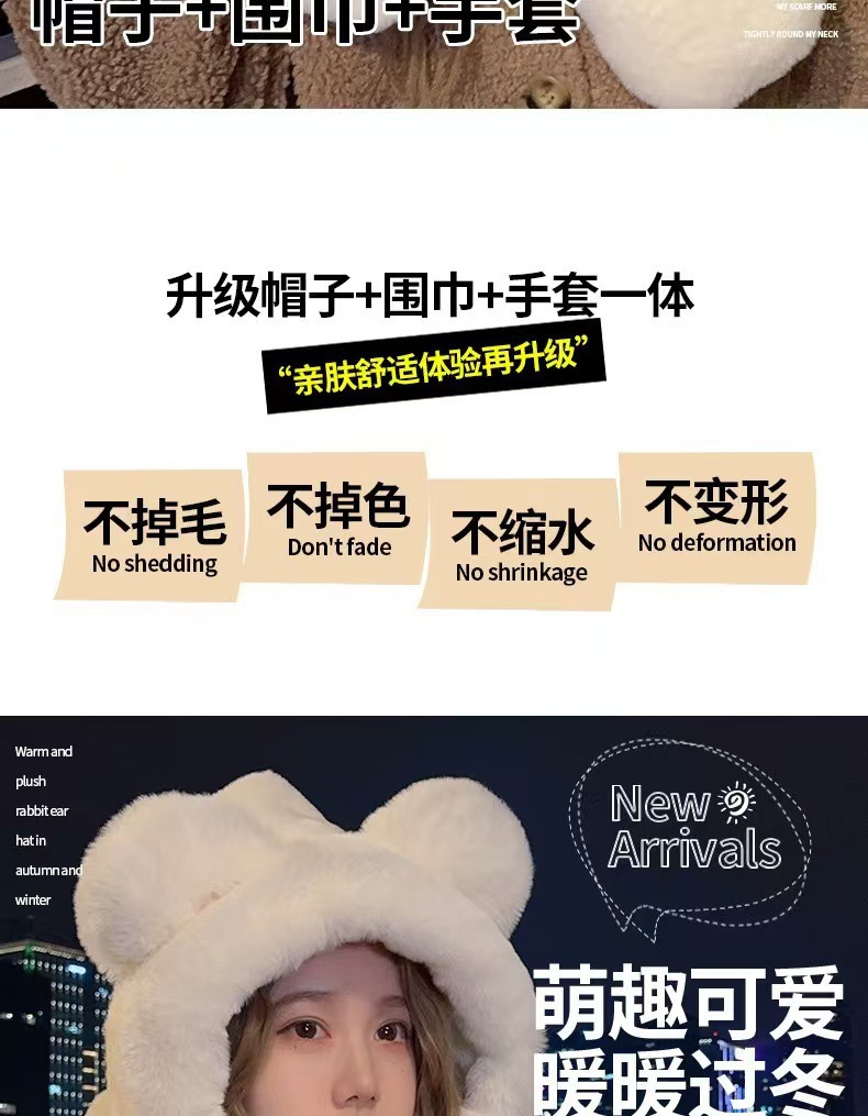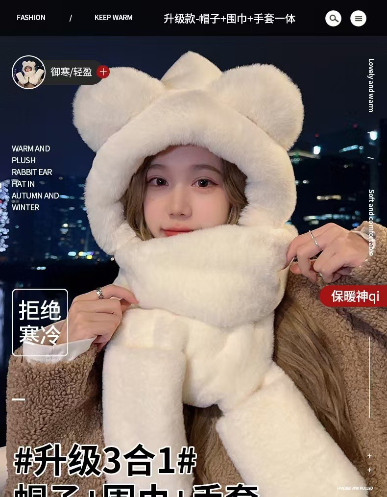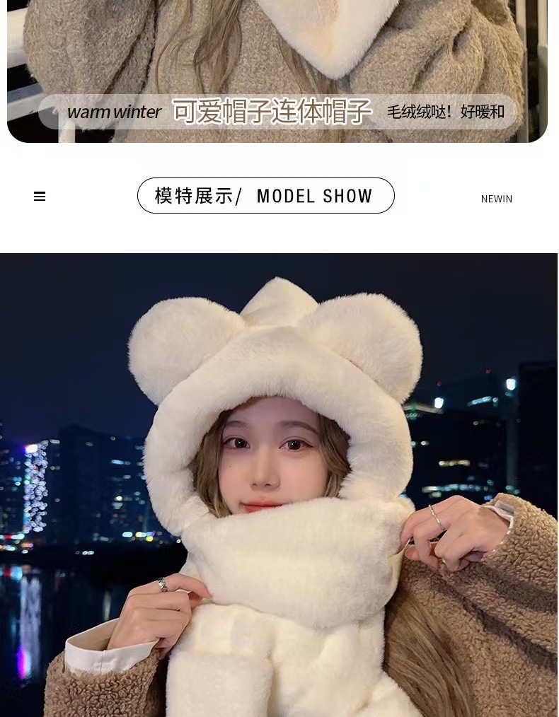 小熊帽子秋冬女款围巾大头围围脖手套一体连帽可爱保暖冬天三件套