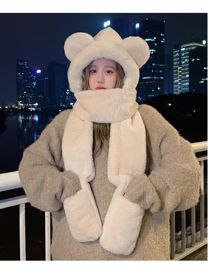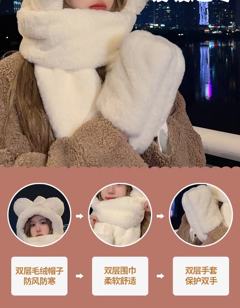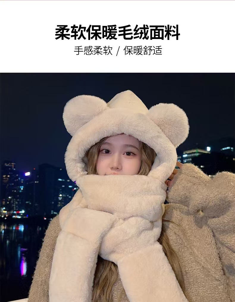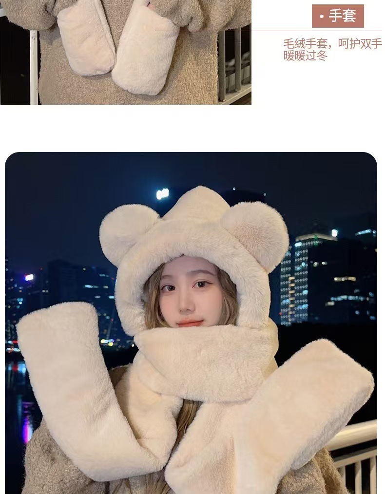 小熊围巾女冬季韩版百搭帽子围脖一体可爱护耳保暖连帽手套三件套