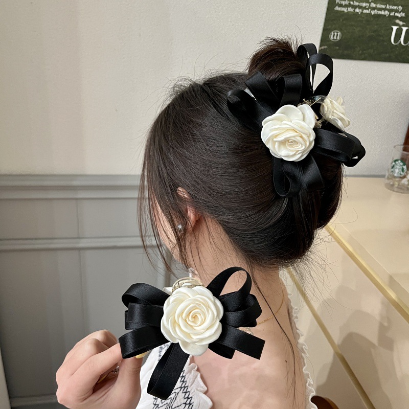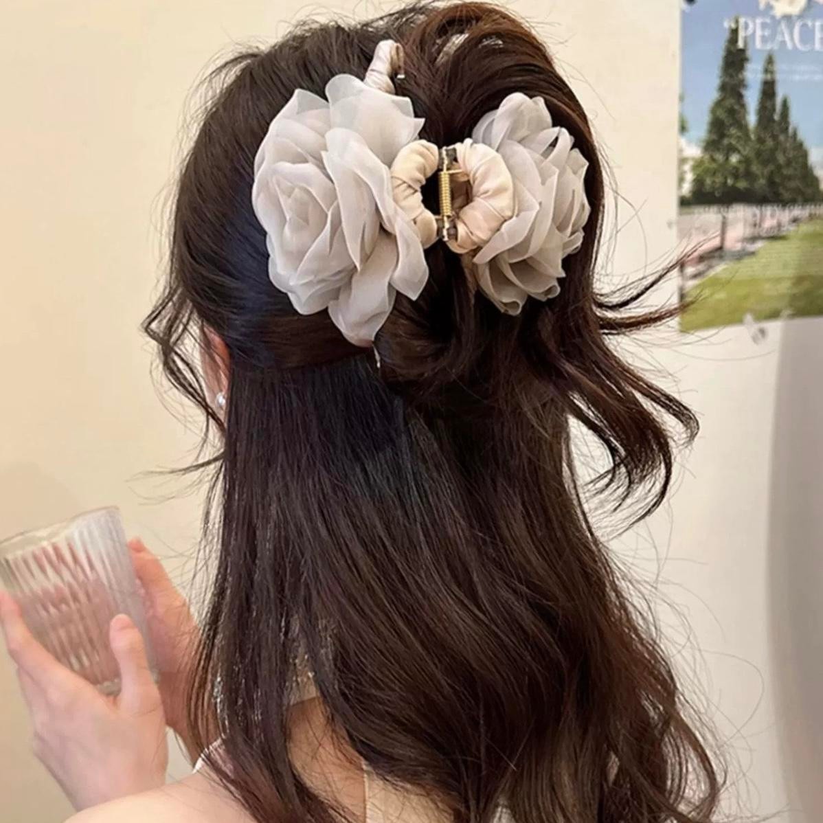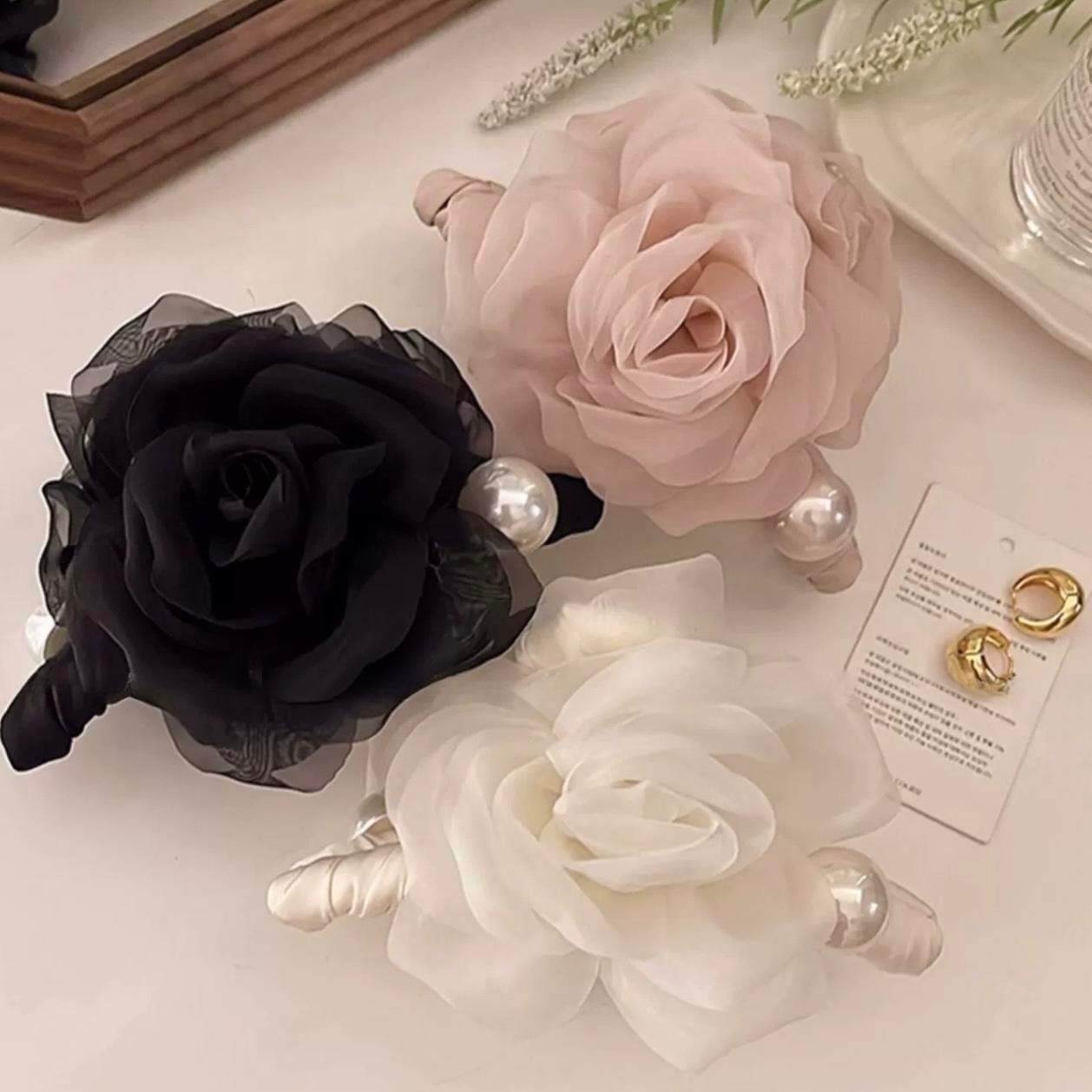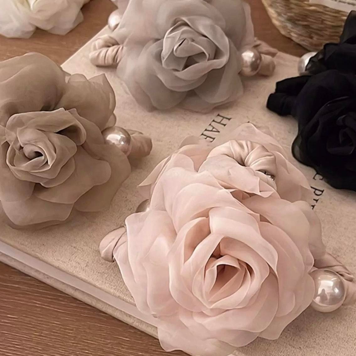 颜色 深粉色轻纱玫瑰花抓夹,黑色轻纱玫瑰花抓夹,米粉轻纱玫瑰花抓夹,咖色轻纱玫瑰花抓夹,绿色轻纱玫瑰花抓夹
