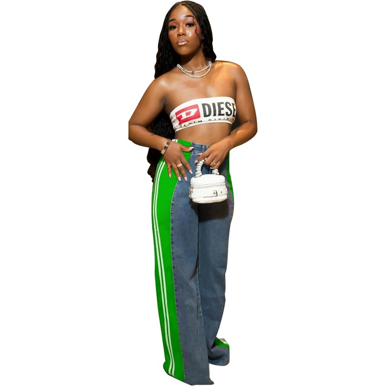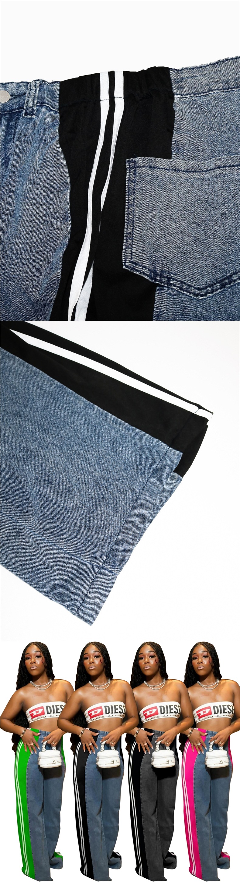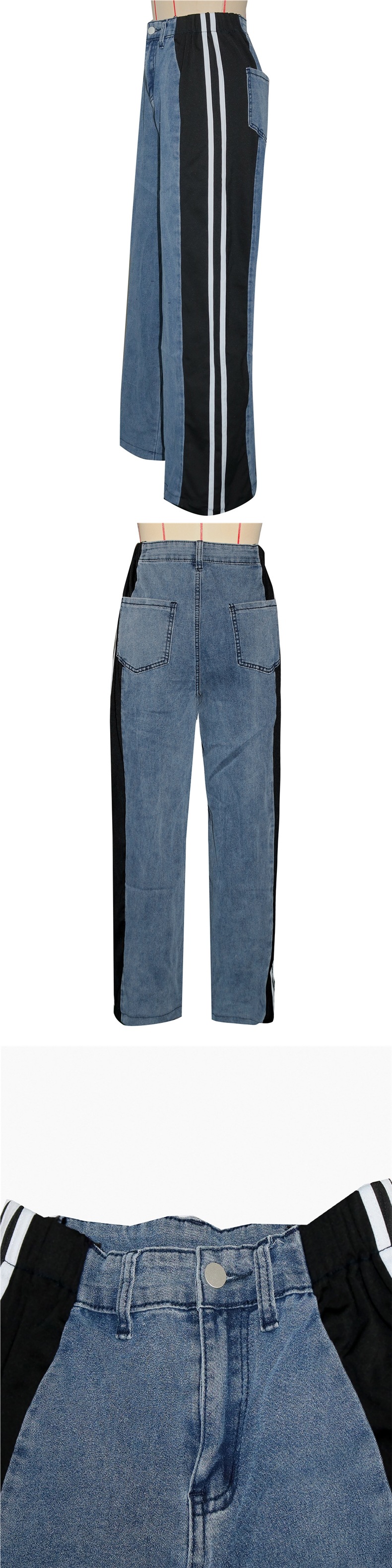 S391244 跨境欧美时尚拼接条纹阔腿牛仔长裤女装 休闲高腰直筒裤