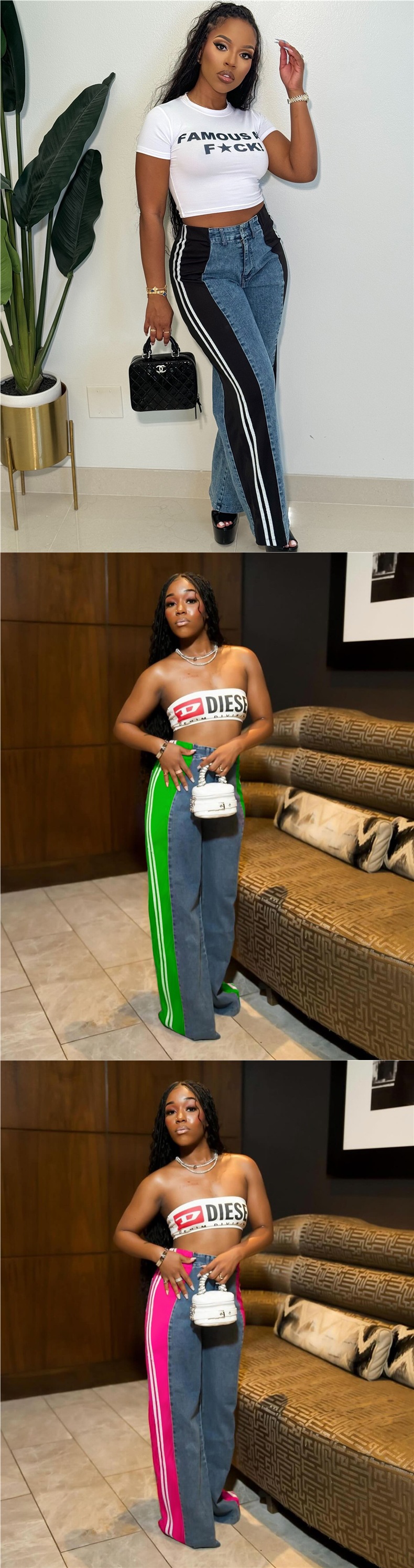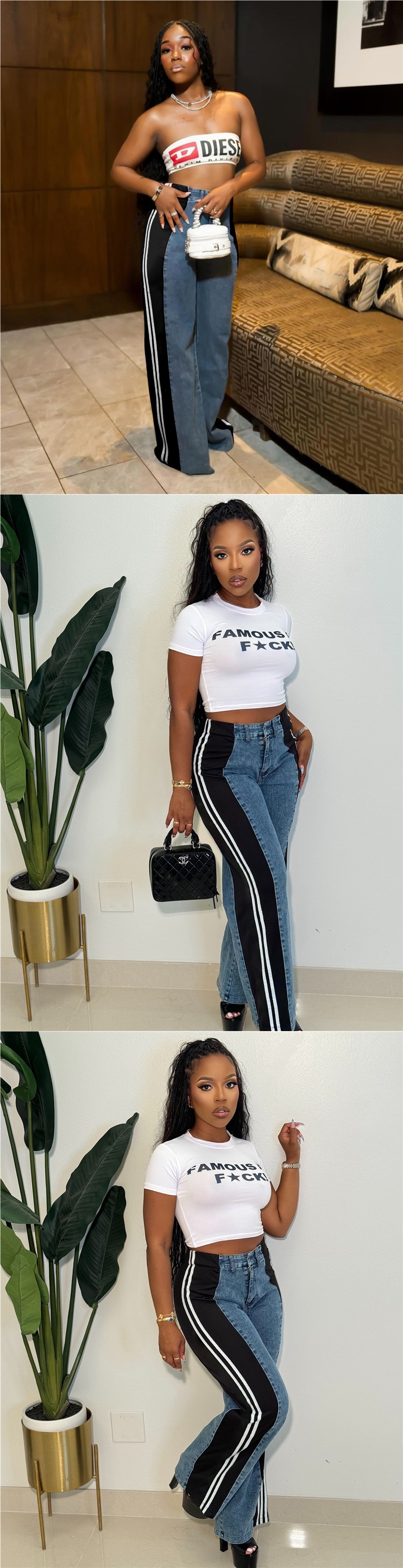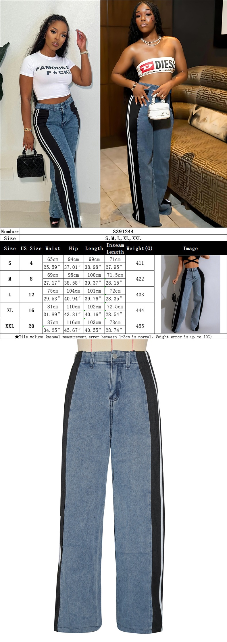 S391244 跨境欧美时尚拼接条纹阔腿牛仔长裤女装 休闲高腰直筒裤