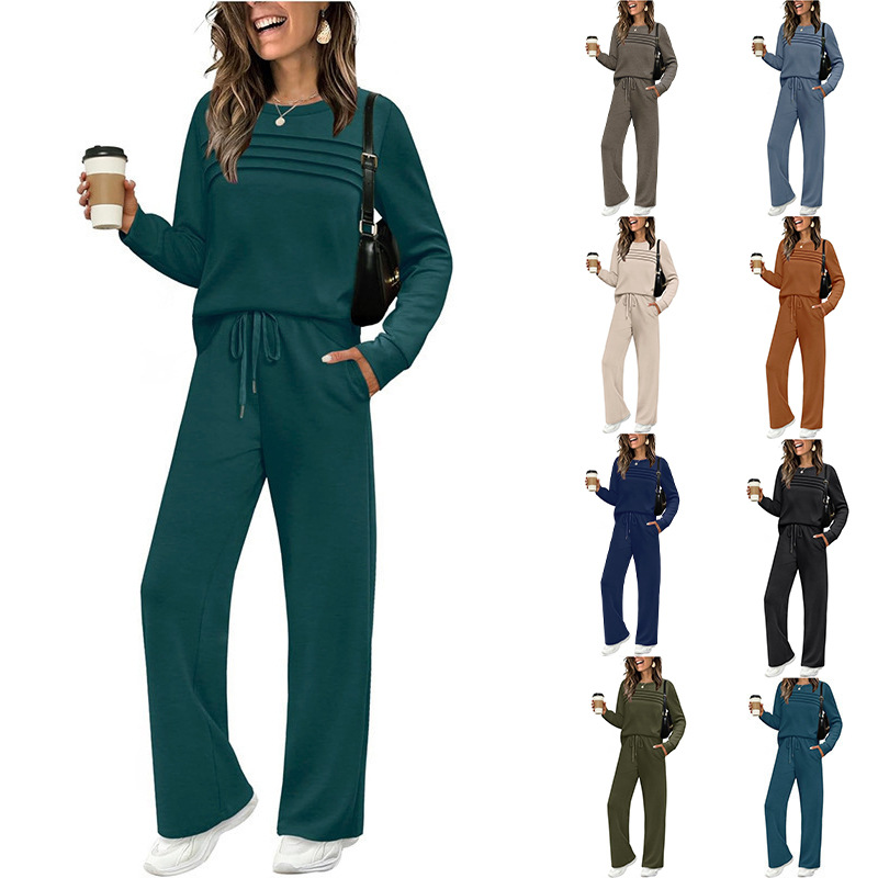 2025新款秋季欧美跨境女士套装长袖圆领上衣休闲松紧腰长裤阔腿裤