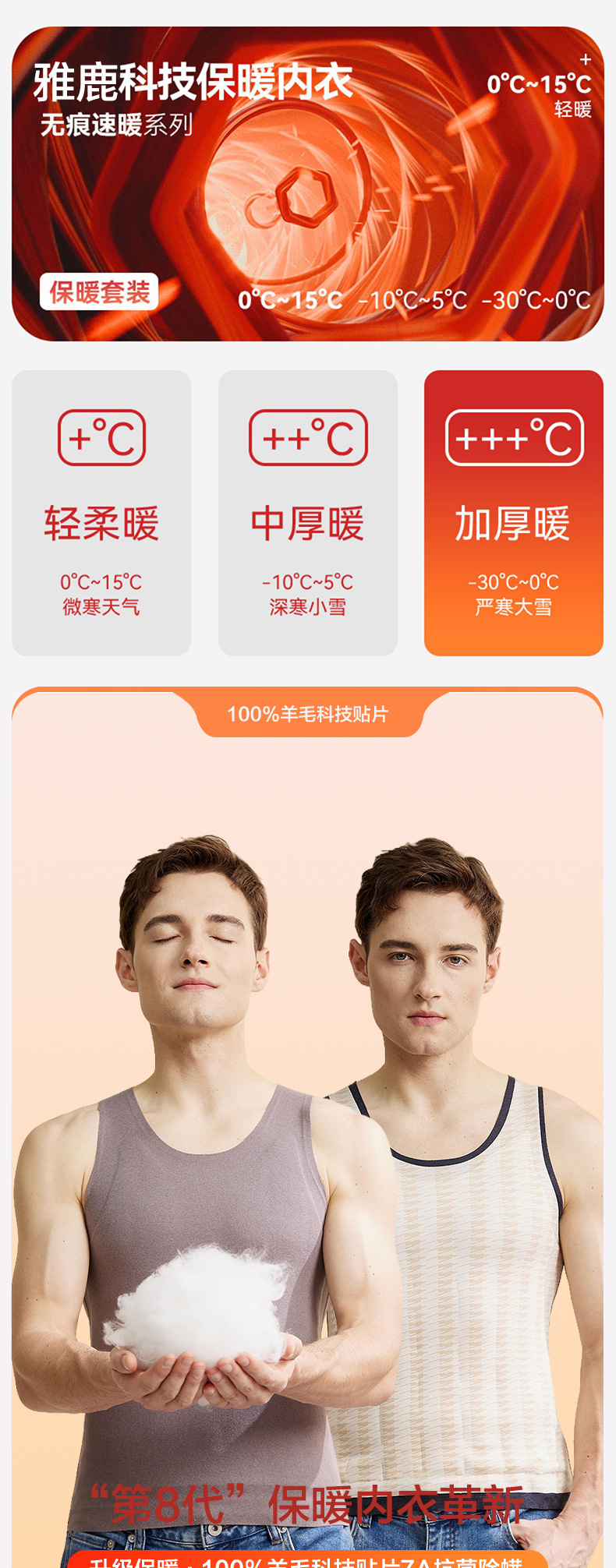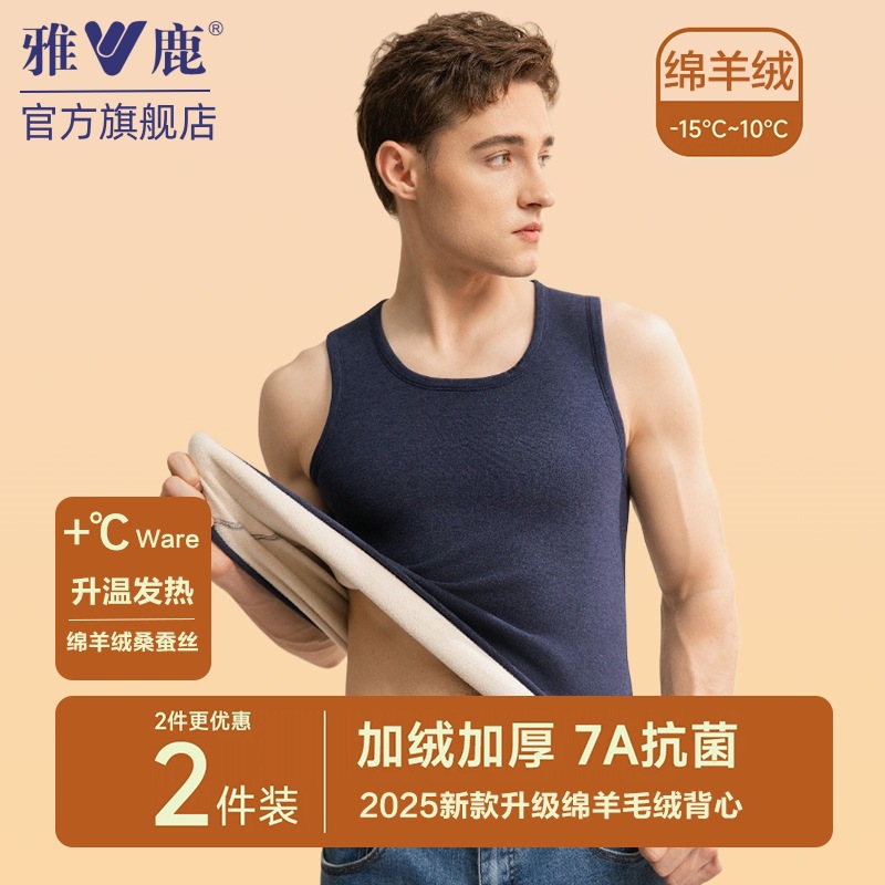 雅鹿羊毛保暖背心男款加绒加厚无痕贴片秋冬季德绒发热上衣内搭