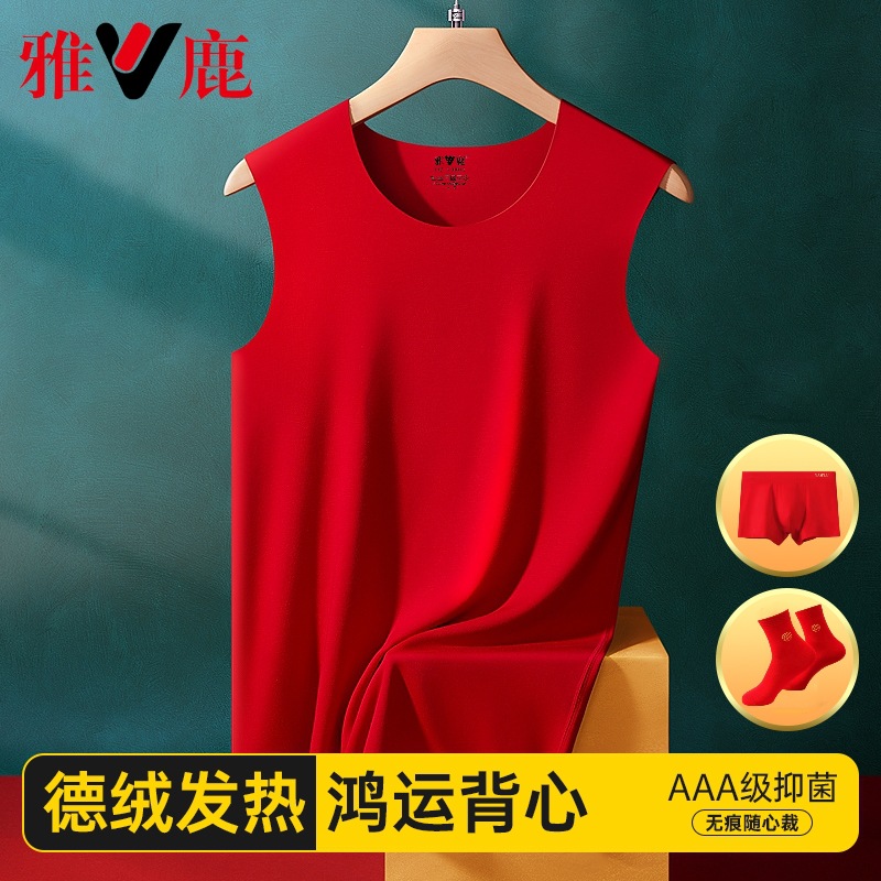 雅鹿メンズレッドベスト デロン2025シームレスインナーウェア 蛇年本命年服 冬用保温下着