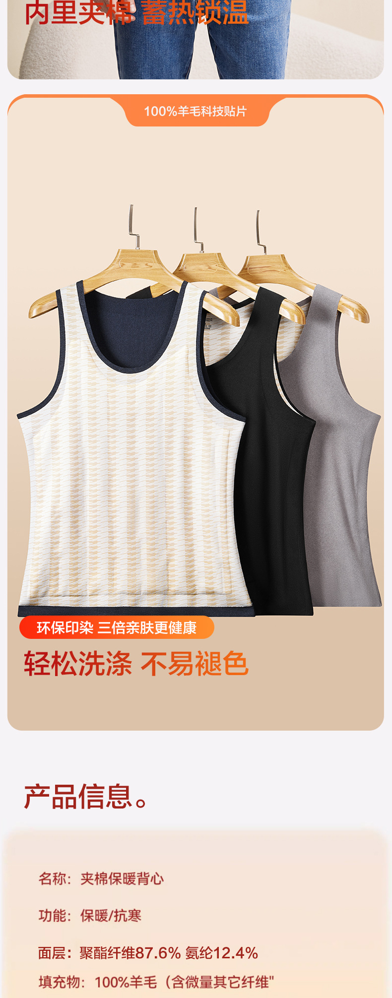 100%绵羊毛填充贴片保暖背心无痕男士马甲上衣女三层加绒加厚秋冬