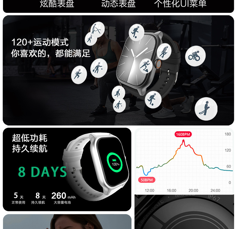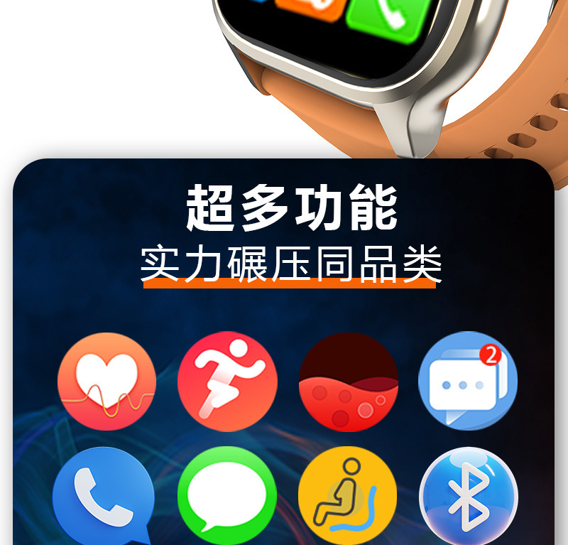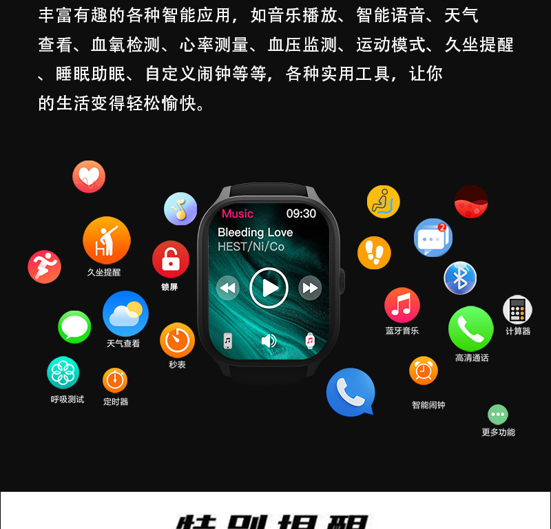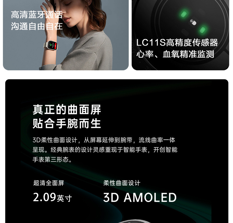 功能 拍照,计步,心率监测,血压测量,社交娱乐,蓝牙通话,智能提醒,遥控自拍,睡眠监测,血氧检测