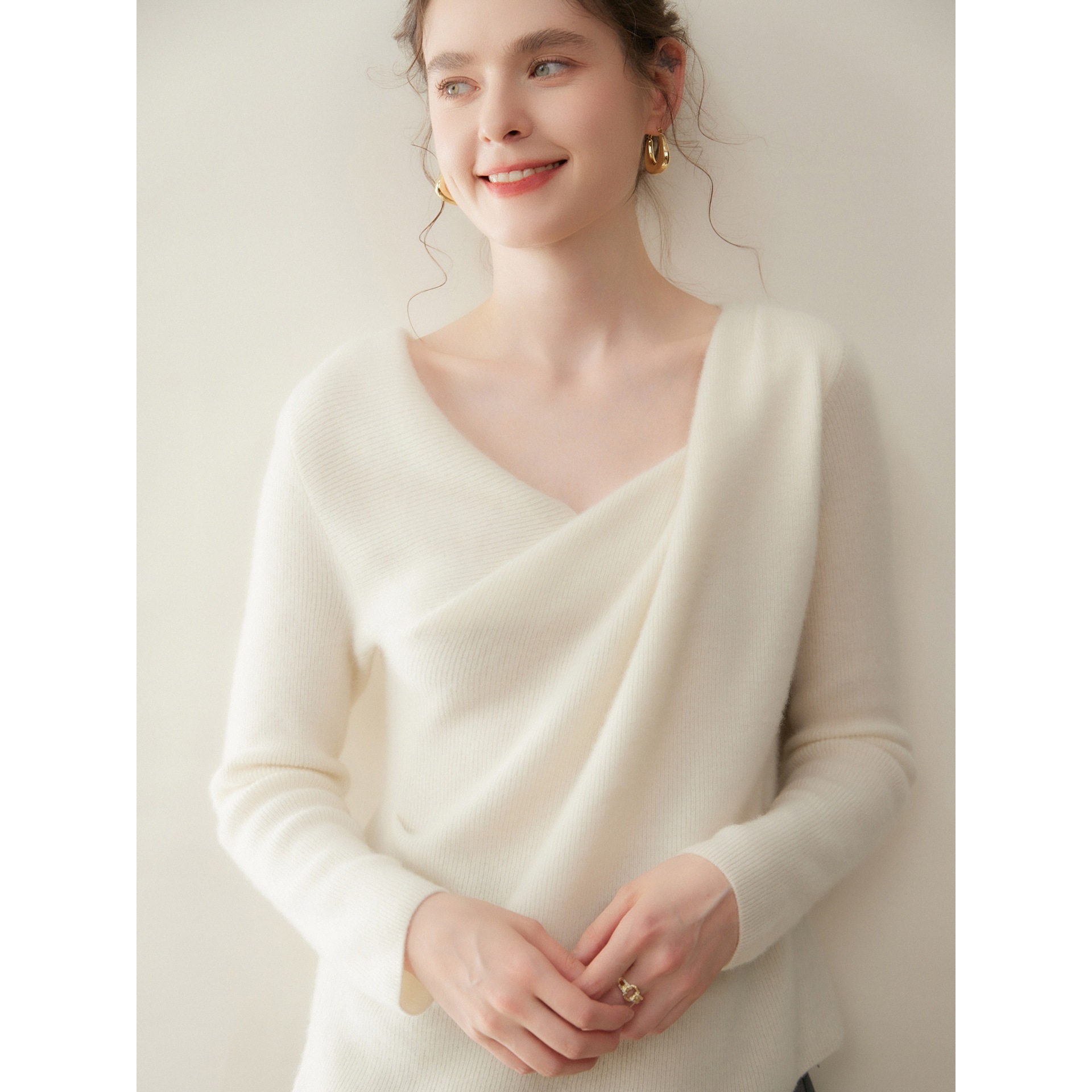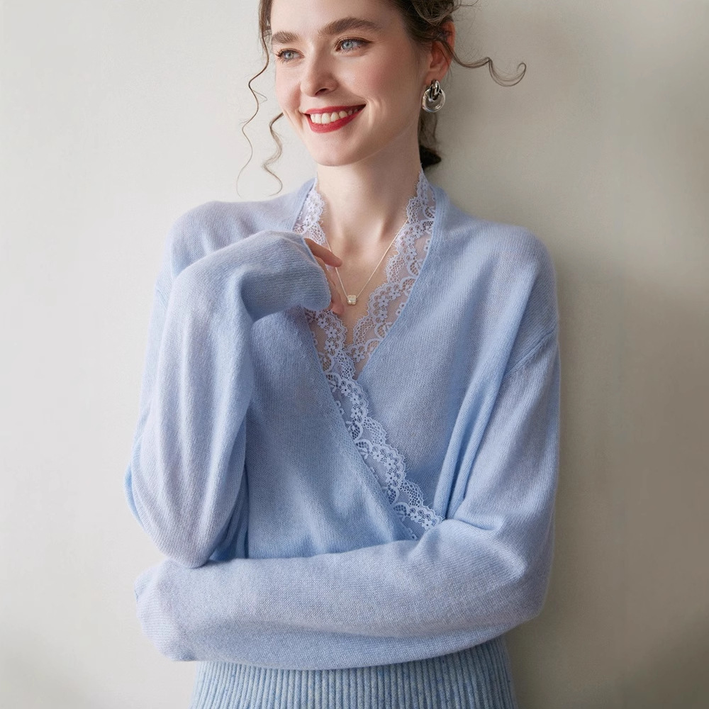 时髦精收!法式蕾丝花边交叉V领羊绒衫女针织上衣毛衣欧货奶白色