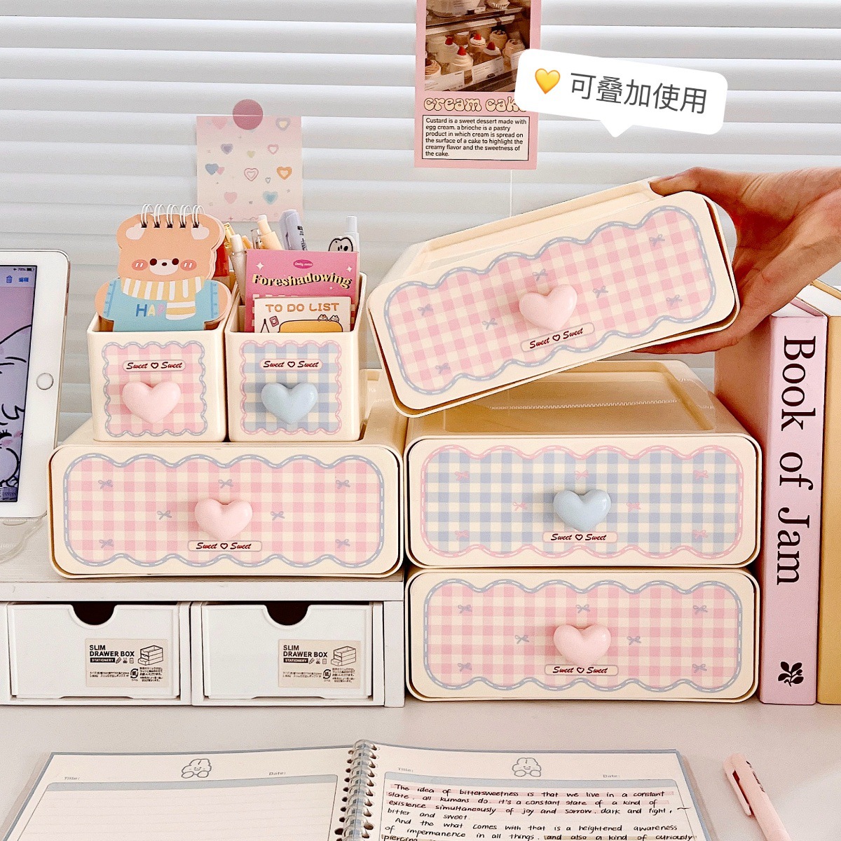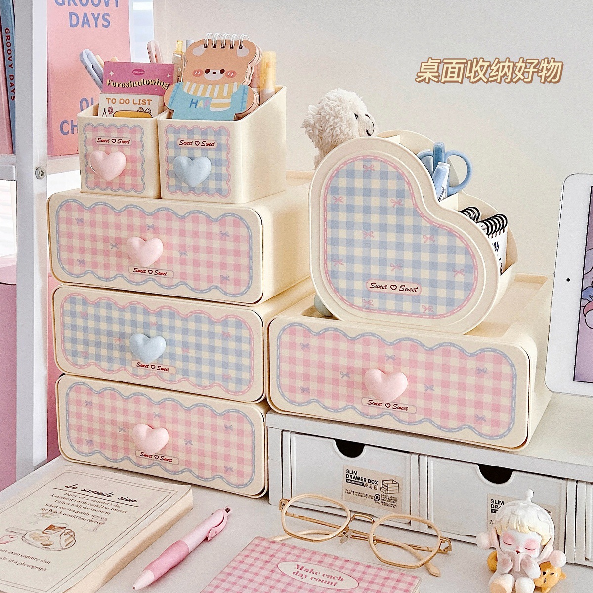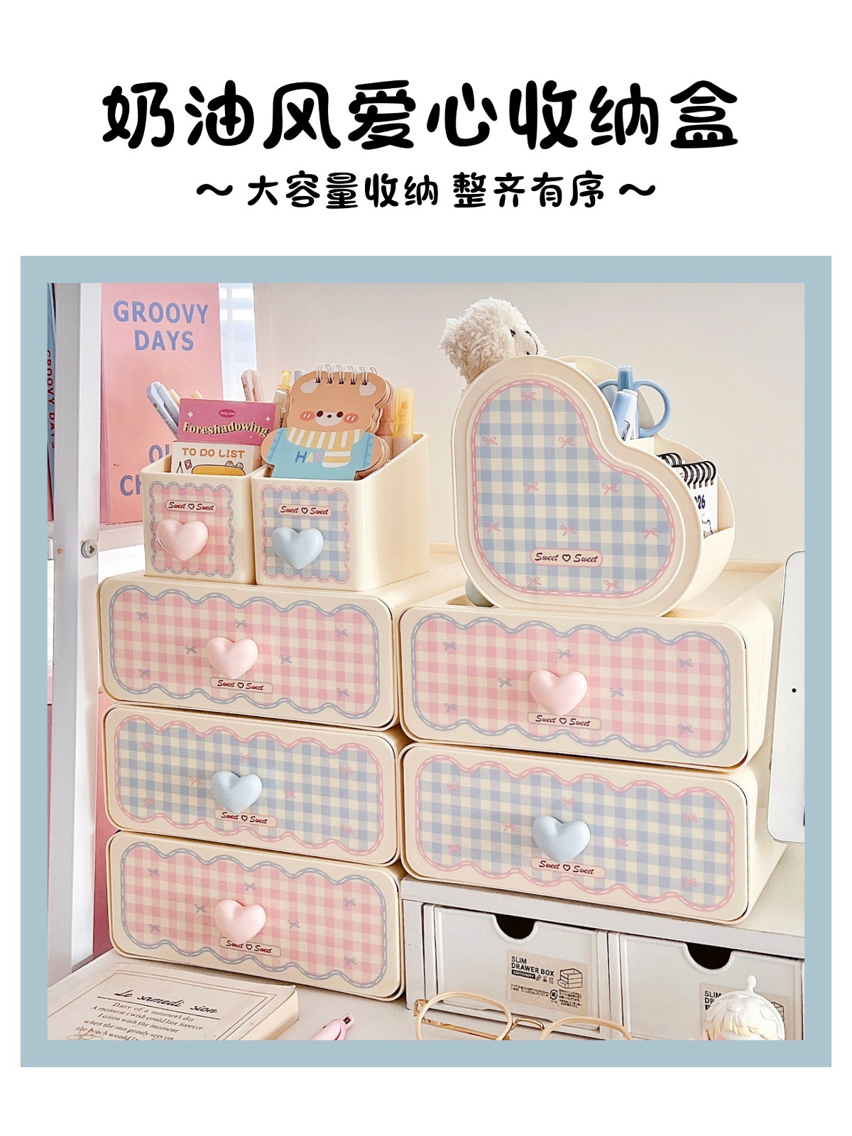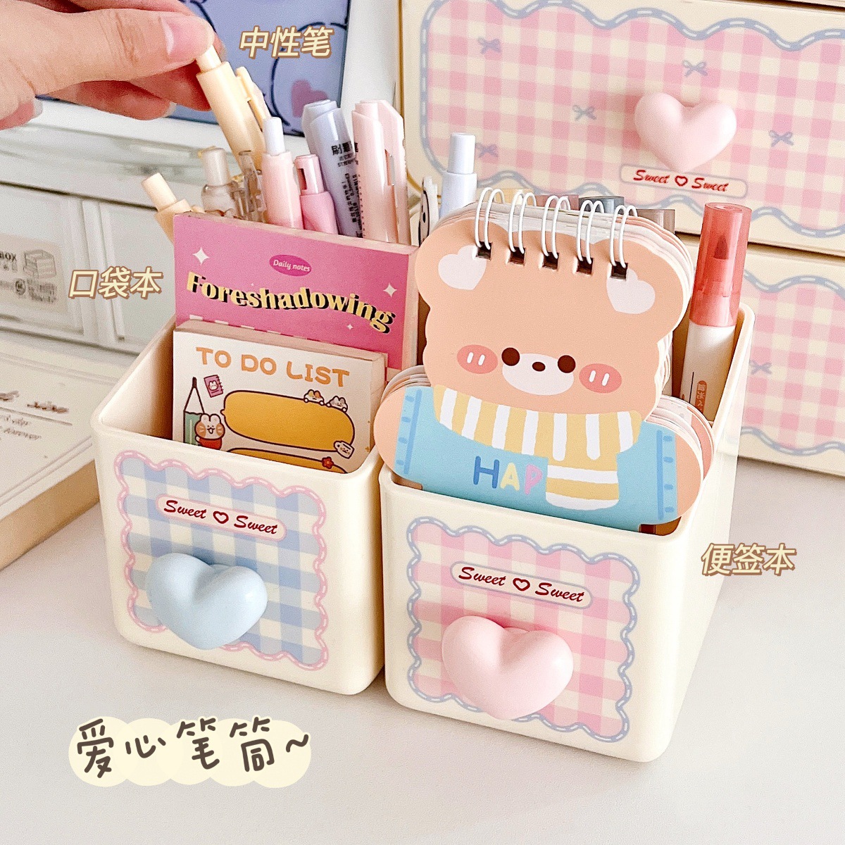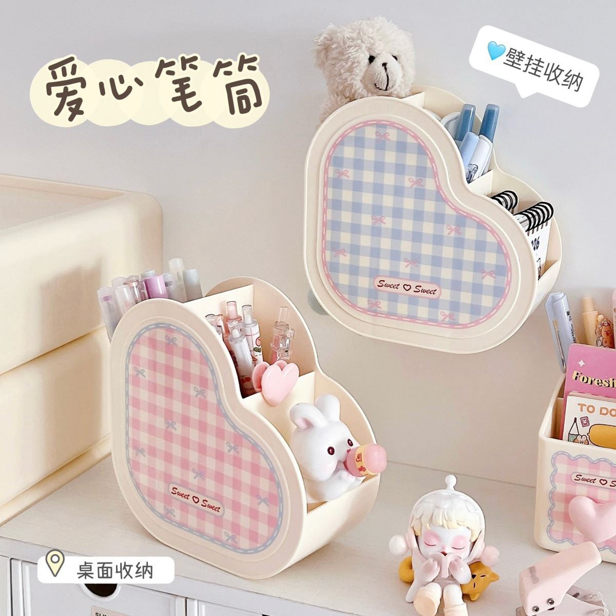 颜色 收纳盒-少女粉【1层】,收纳盒-奶油蓝【1层】,粉色爱心收纳盒,蓝色爱心收纳盒,粉色笔筒,蓝色笔筒