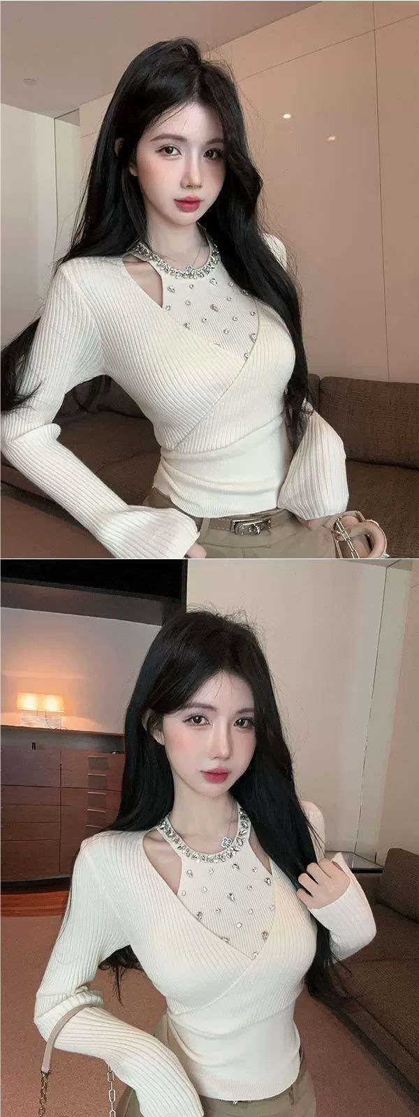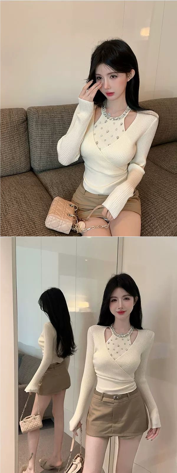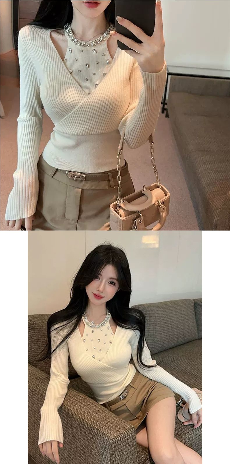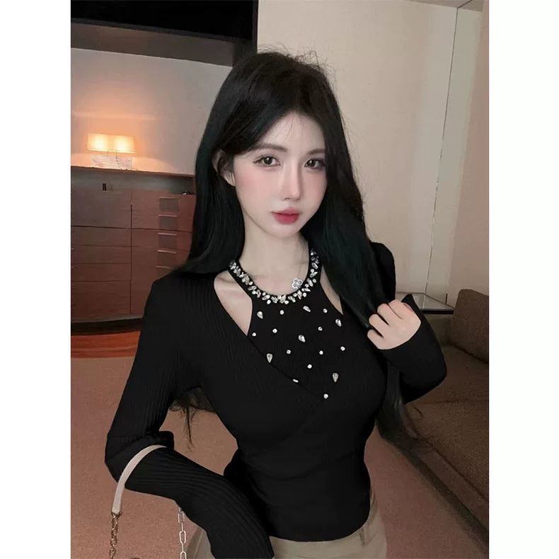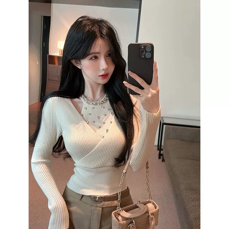 小香风重工镶钻针织衫女秋冬假两件挂脖上衣打底衫内搭感毛衣