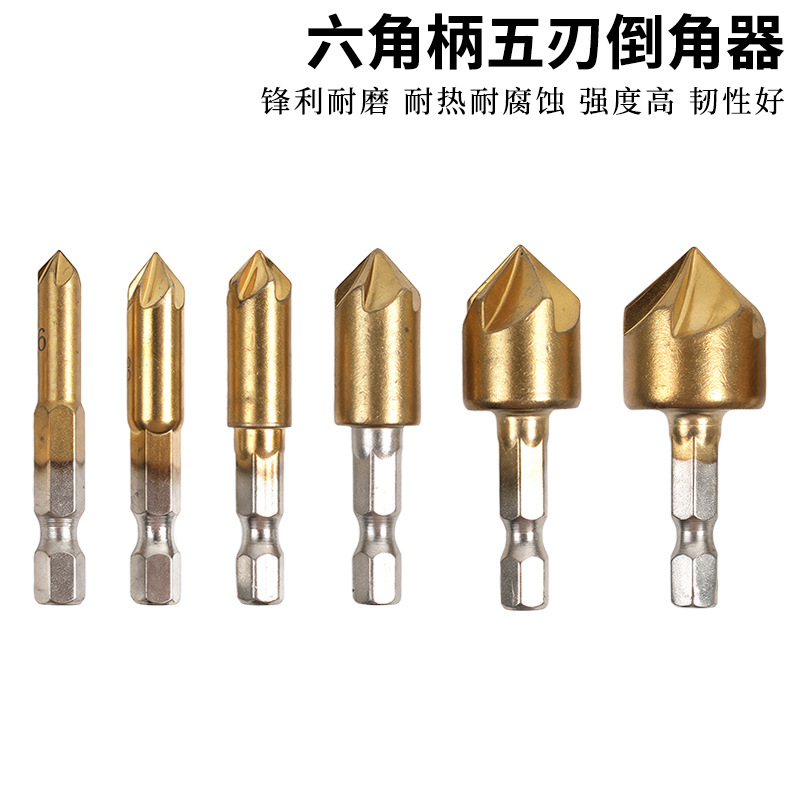 クロスボーダー六角柄チタンメッキ五刃面取り器90度穴あけドリル6-19木工面取りナイフセット穴あけ器
