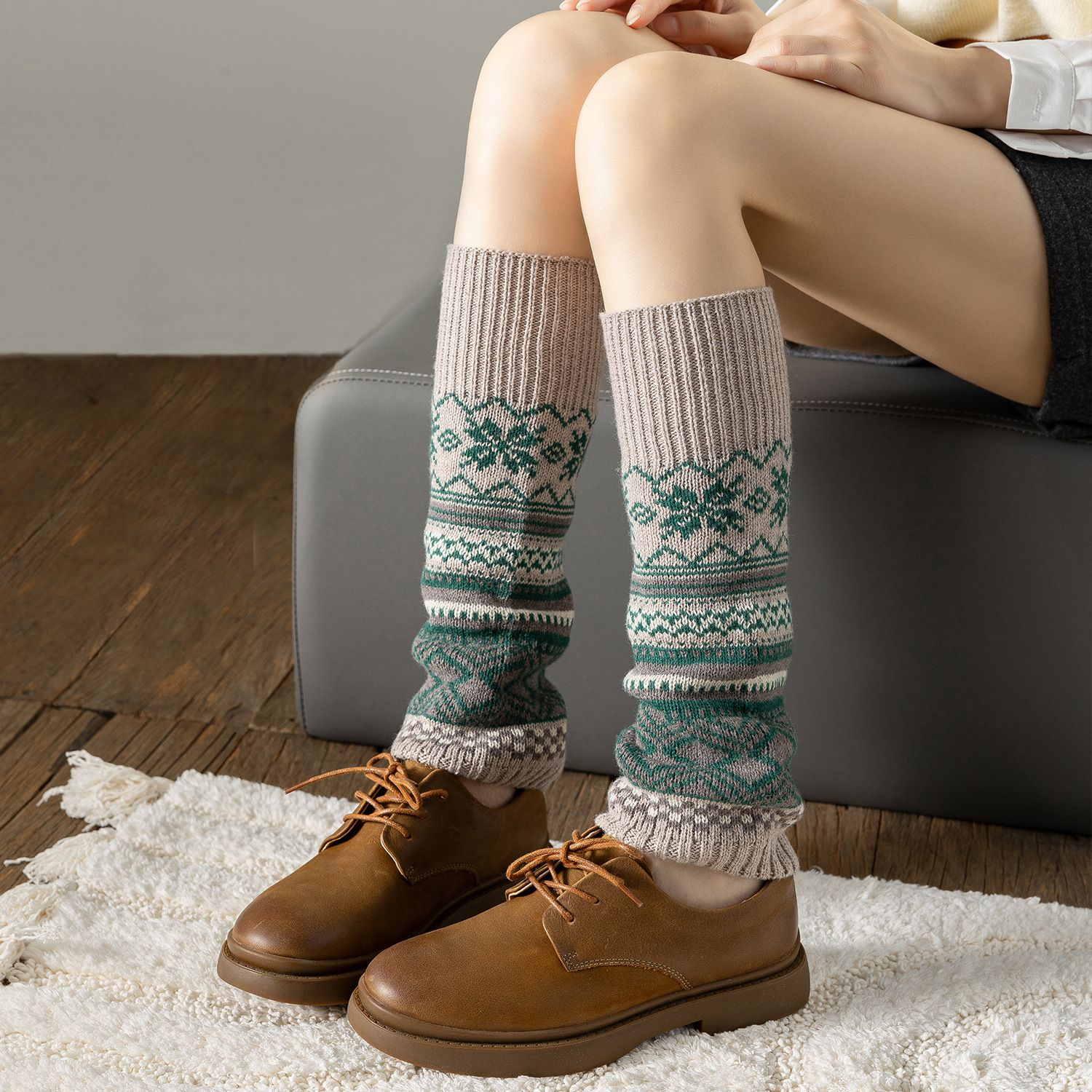 羊绒针织袜套秋冬保暖堆堆袜复古圣诞雪花撞色腿套中筒小腿袜靴套