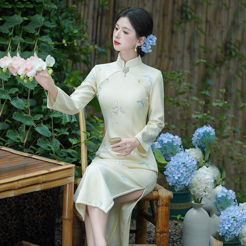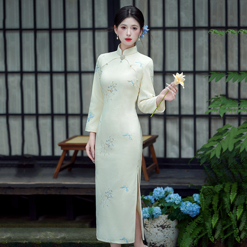 刺绣米白色国风中式苏州秋季长袖改良旗袍年轻款女复古修身秋冬装