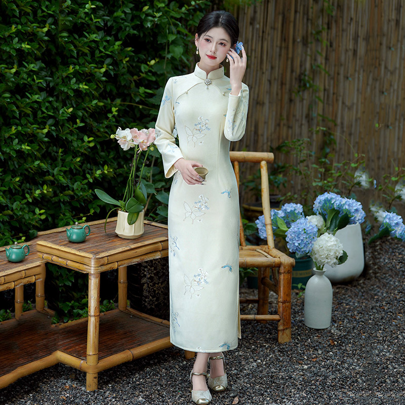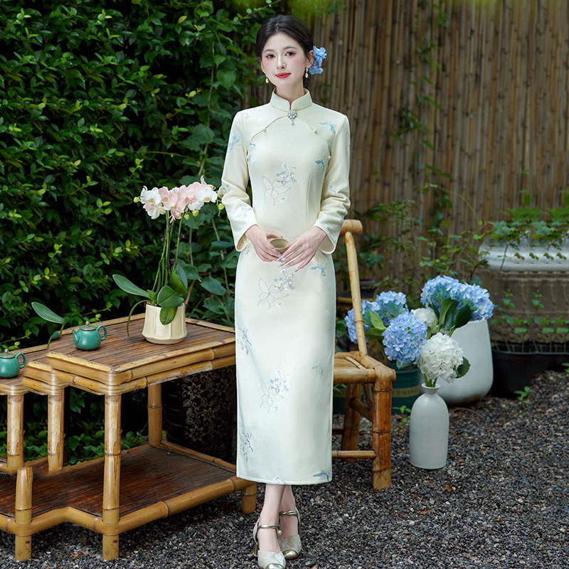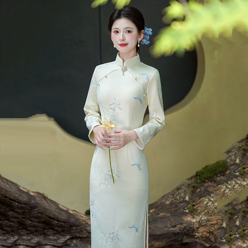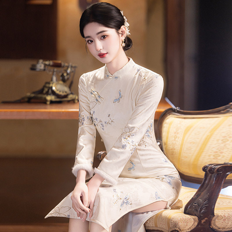 刺绣蝴蝶白色加绒秋冬装国风新中式长袖改良旗袍冬季厚款女高级感