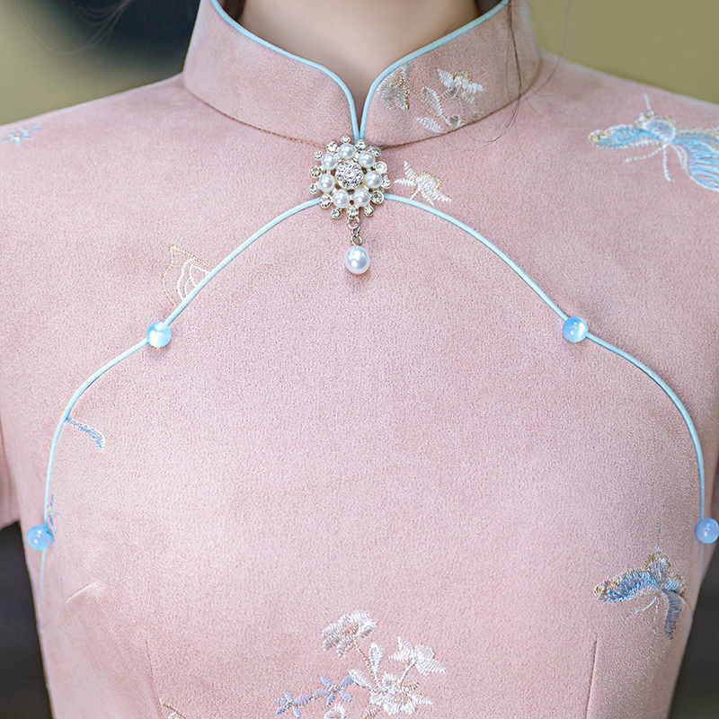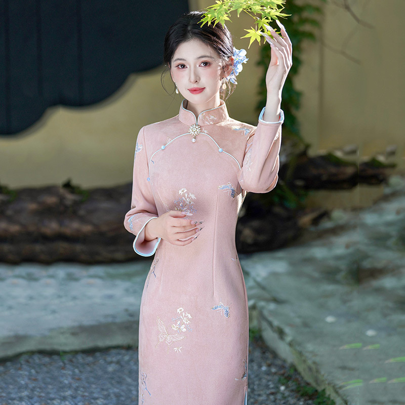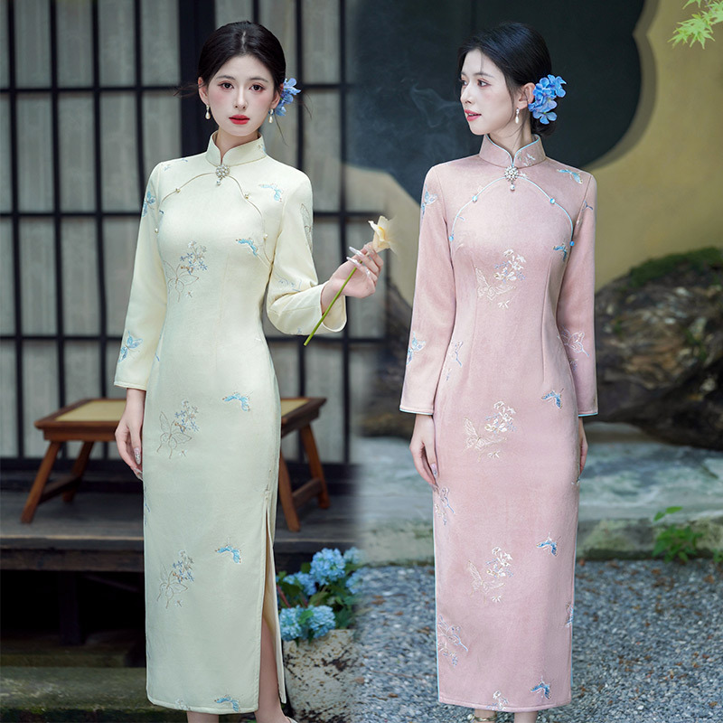 麂皮绒绣花复古改良款旗袍新款民国风减龄气质日常订婚连衣裙秋冬