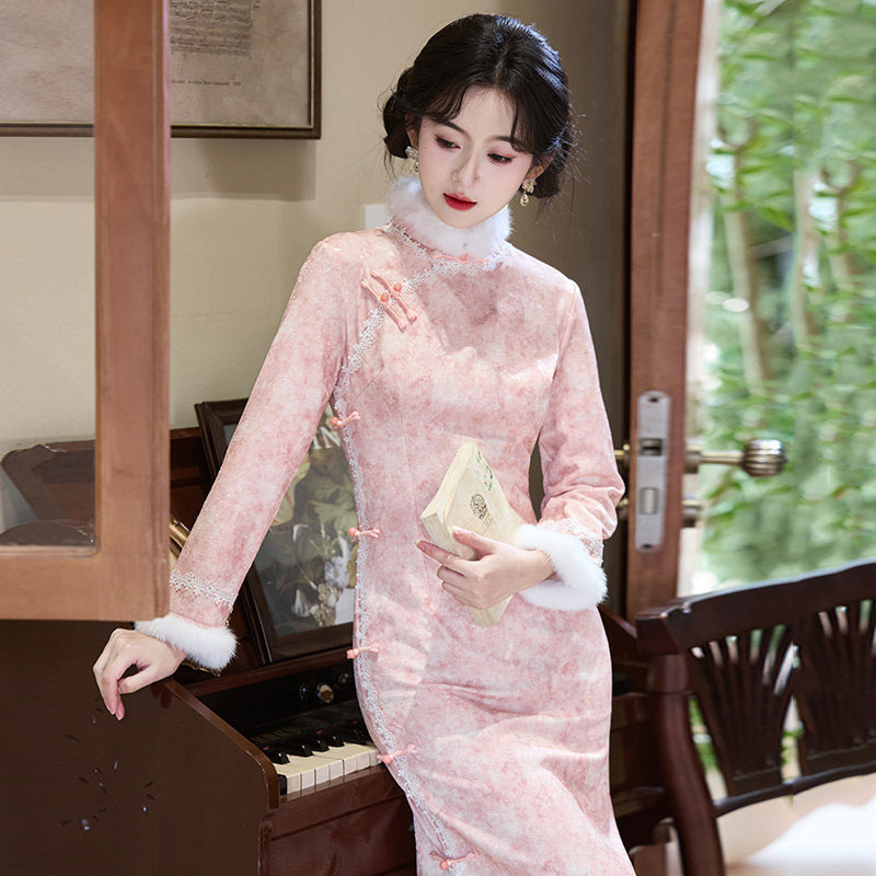 粉色加绒冬装国风新中式长款长袖旗袍冬季厚款改良年轻款女内搭款