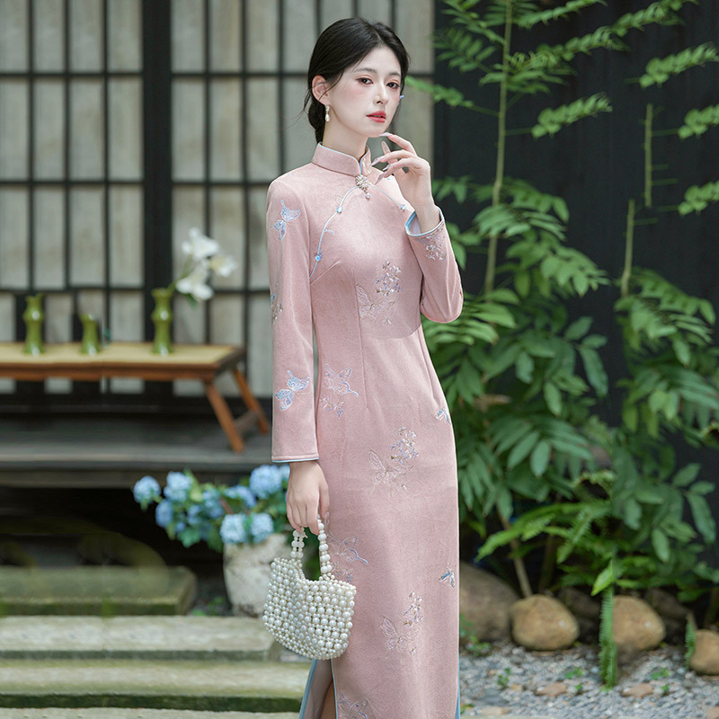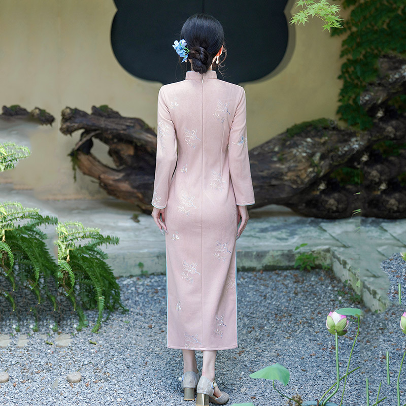 ピンク色の中国風新中式ロング丈長袖旗袍改良版、若い女性向け、高級感のあるレトロなスリムフィット春秋服
