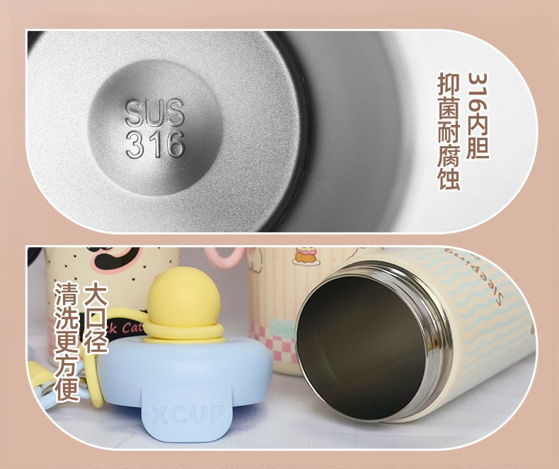 高颜值316不锈钢浮球保温杯大容量卡通可爱吸管杯便捷带提绳水杯