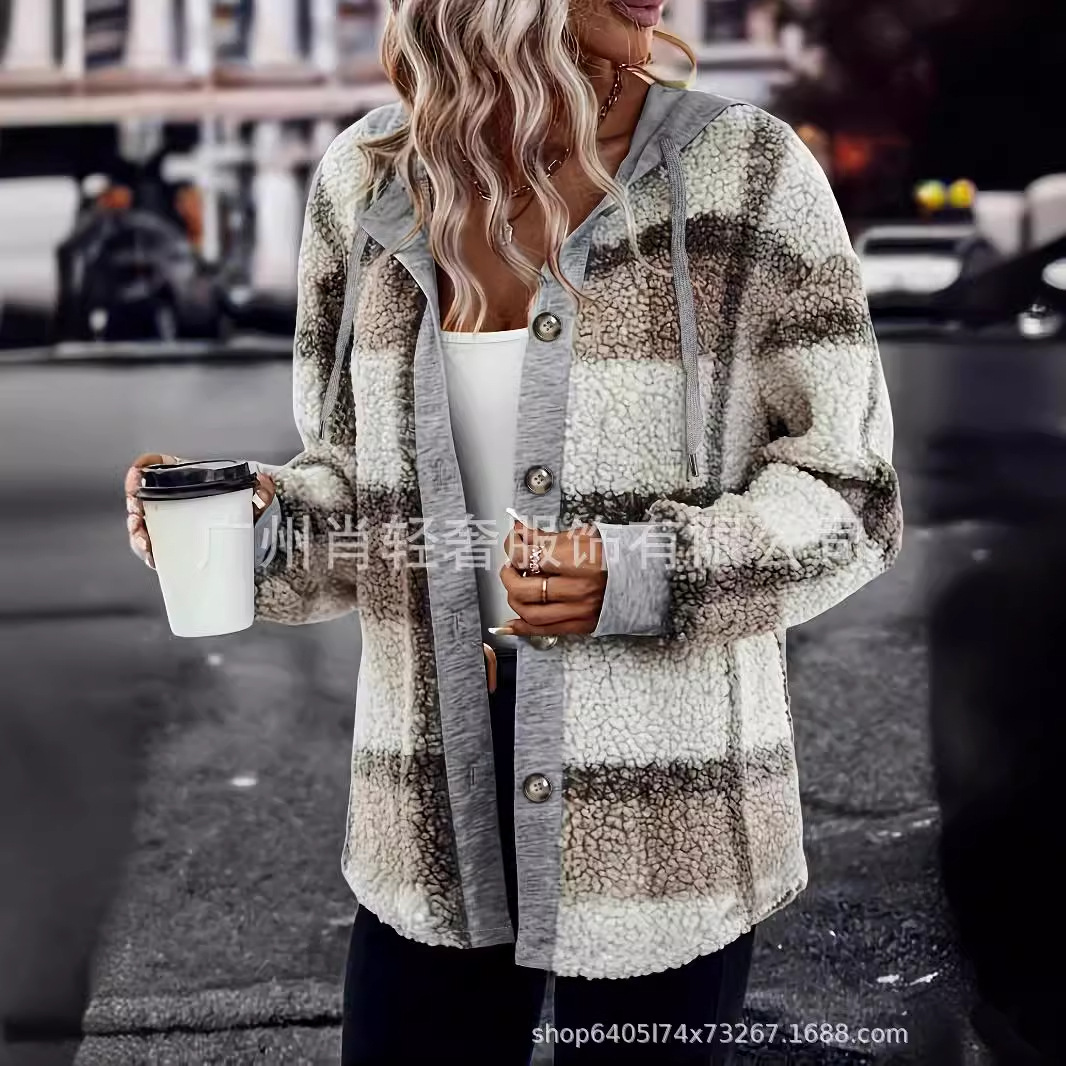 欧米の女性の格子の毛の毛皮はニットの帽子のボタンのコートをつなぎ合わせます。