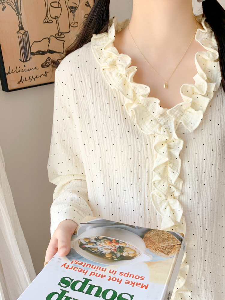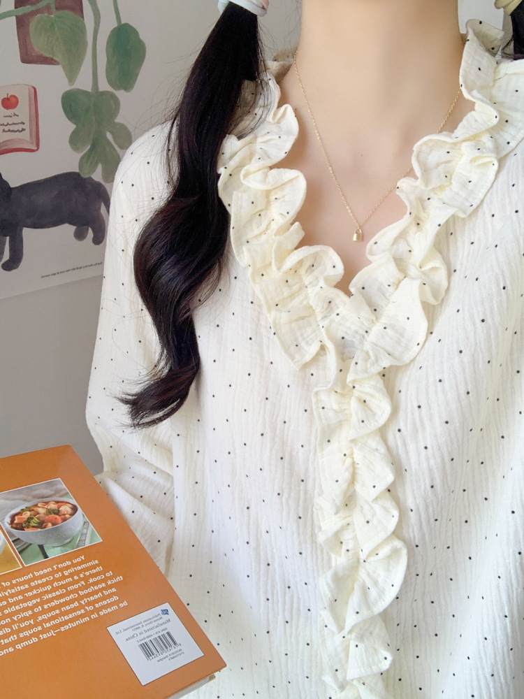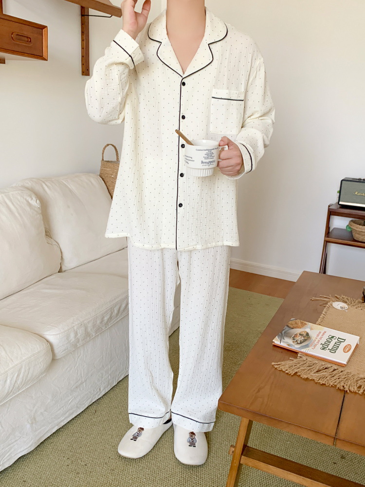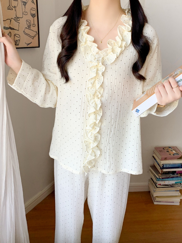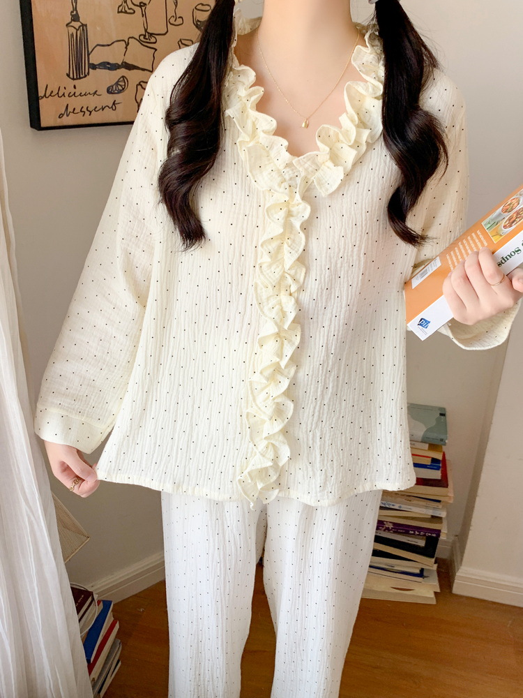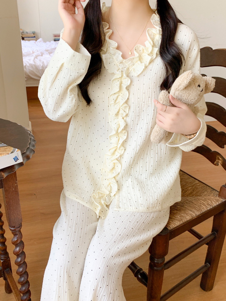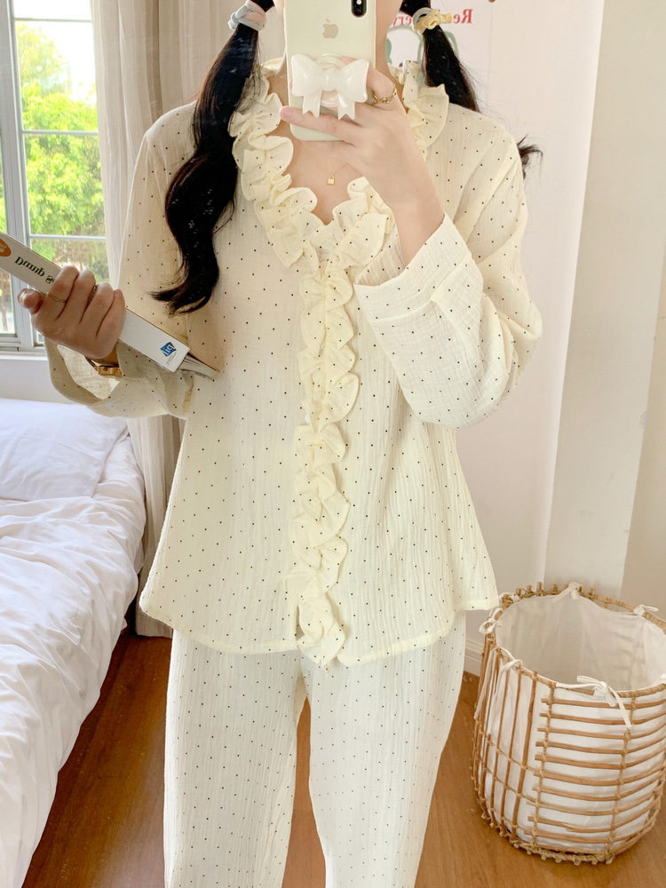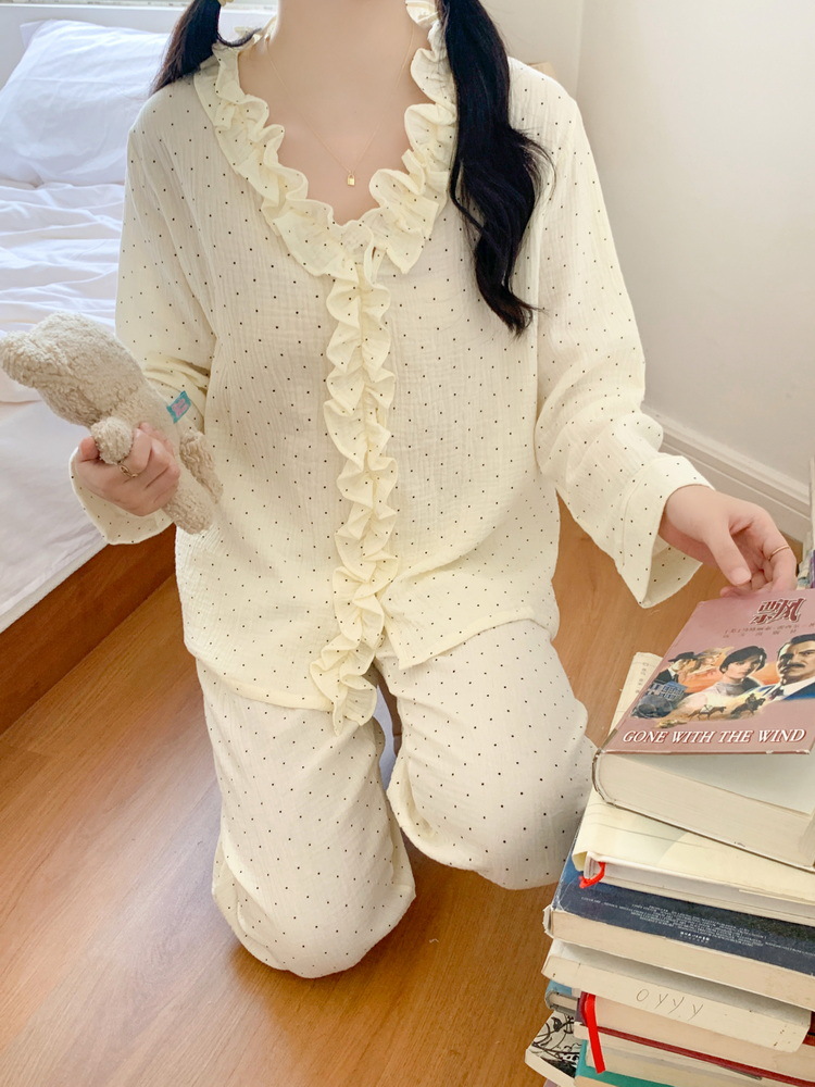 韩国ins女士春秋新品韩版舒适波点双层纱木耳边情侣长袖长裤睡衣