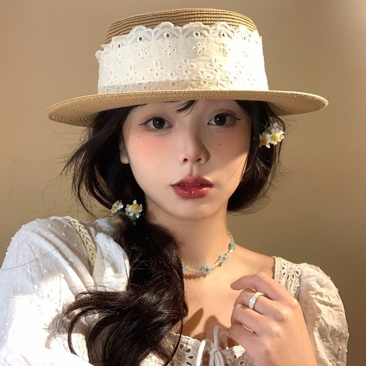 レース編み麦わら帽子レディース夏フレンチヘップバーン風フラットトップ草編み帽子海辺休暇日よけ日焼け止め帽子潮