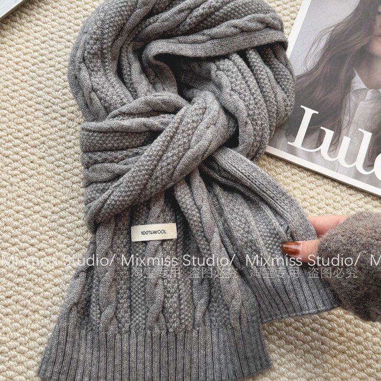 韩国原单款2025新款老钱风羊毛混纺麻花锁边针织围巾女韩系氛围感
