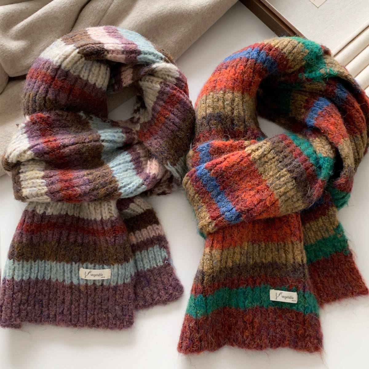 出口日单2025落池针织~羊毛混纺复古扎染撞色条纹围巾秋冬季学生