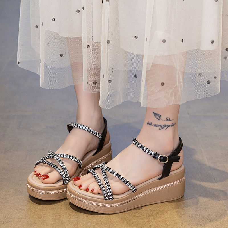 女性の夏のアウターウェア用ウェッジサンダル 2025 ラインストーンフラットソールスカート付きファッショナブルなハイエンドソフトソール厚底ママシューズ