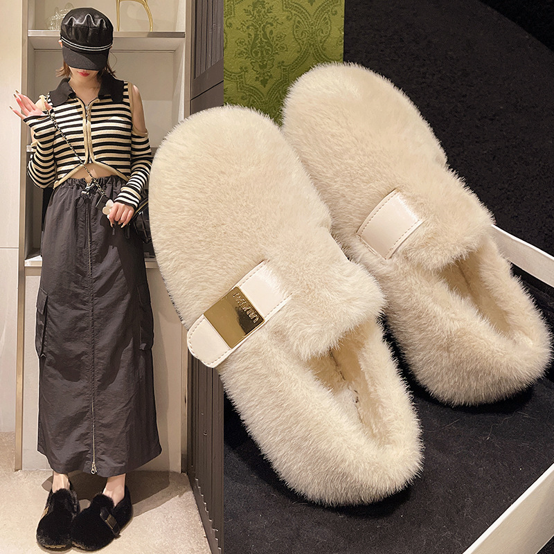 简约百搭毛毛鞋女外穿2025冬季新款加绒保暖懒人一脚蹬平底棉鞋女